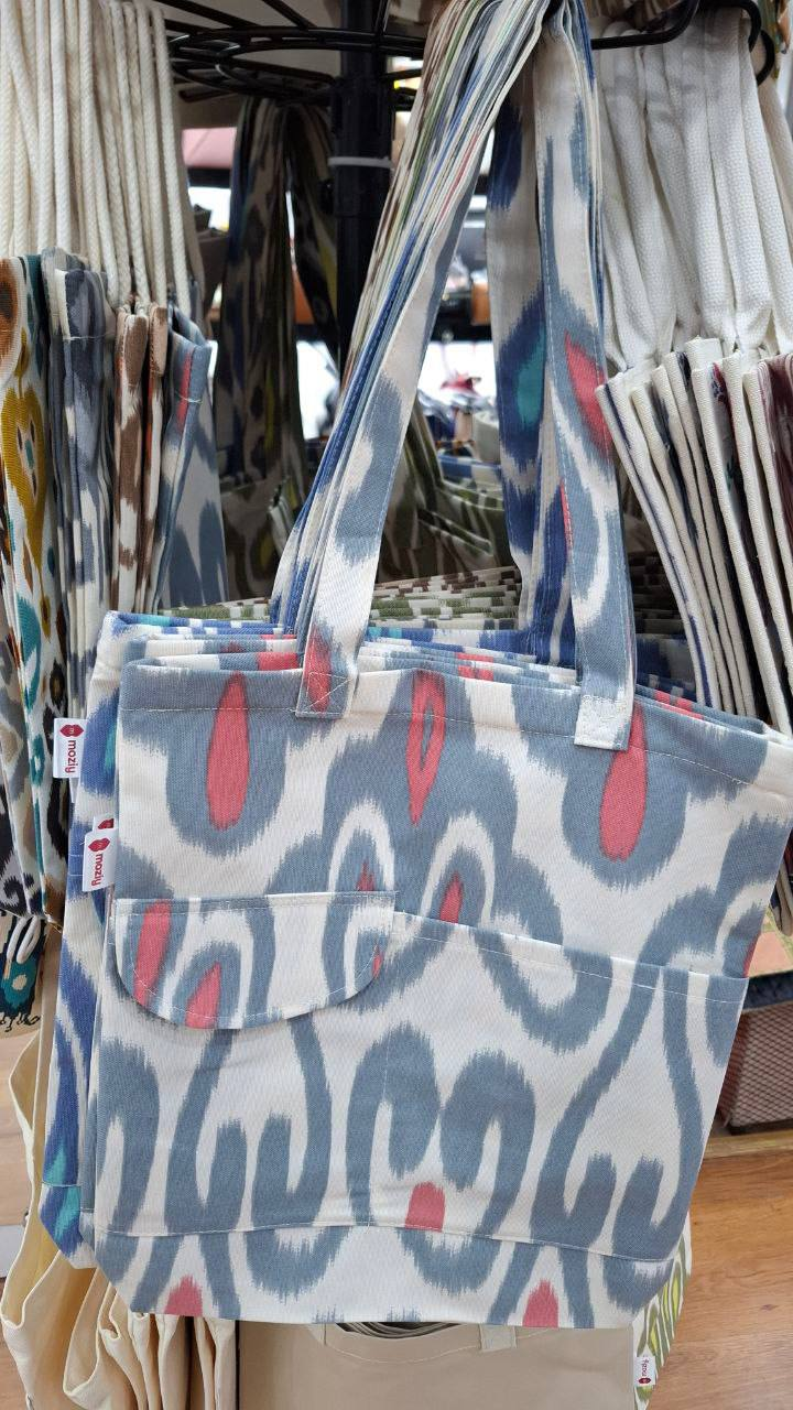 This elegant canvas tote bag features a soft blue ikat-inspired pattern accented with subtle red details, reflecting the timeless beauty of traditional Uzbek textiles. The design blends cultural heritage with a modern, minimal aesthetic, making it a versatile accessory for everyday use.