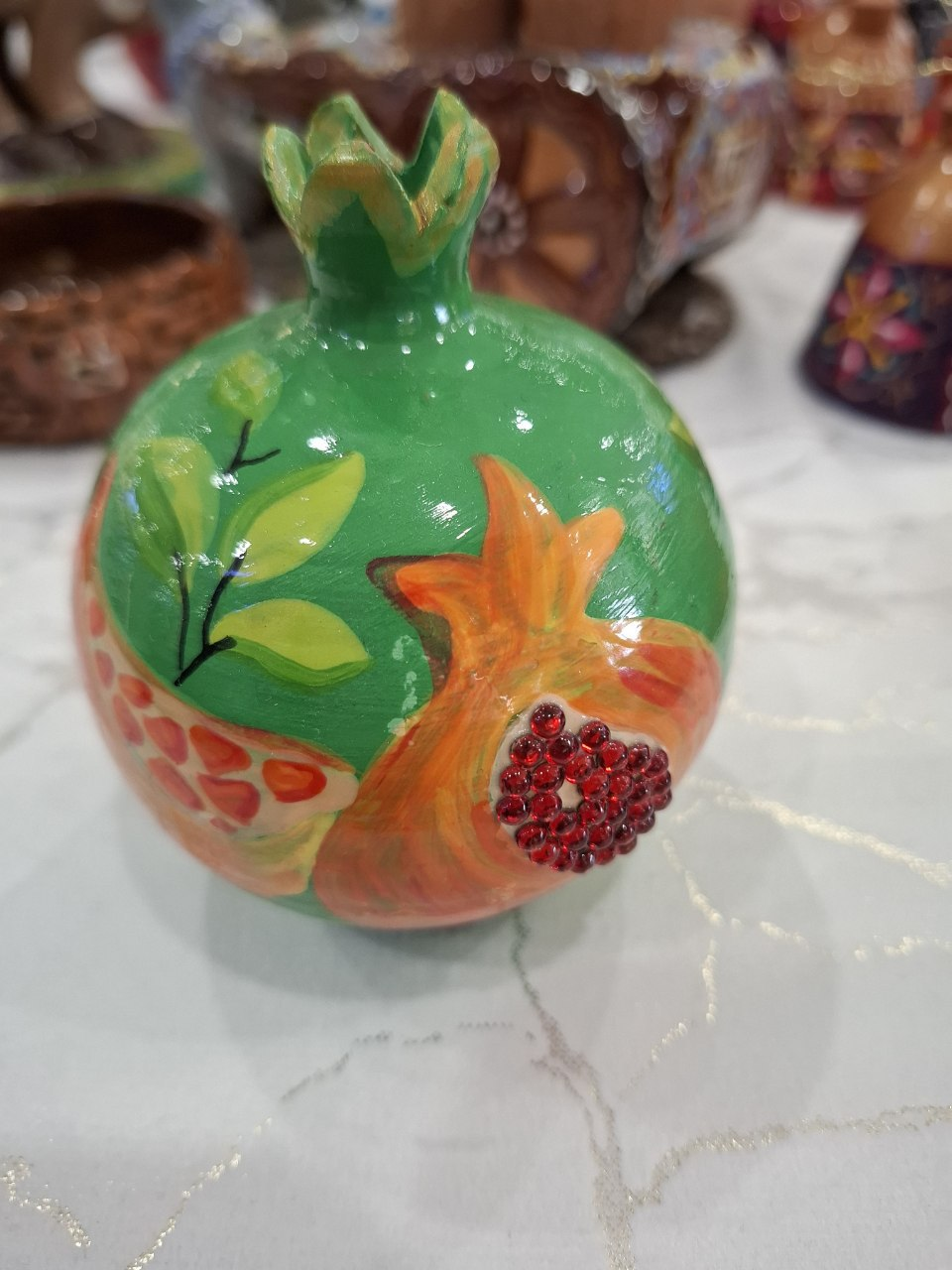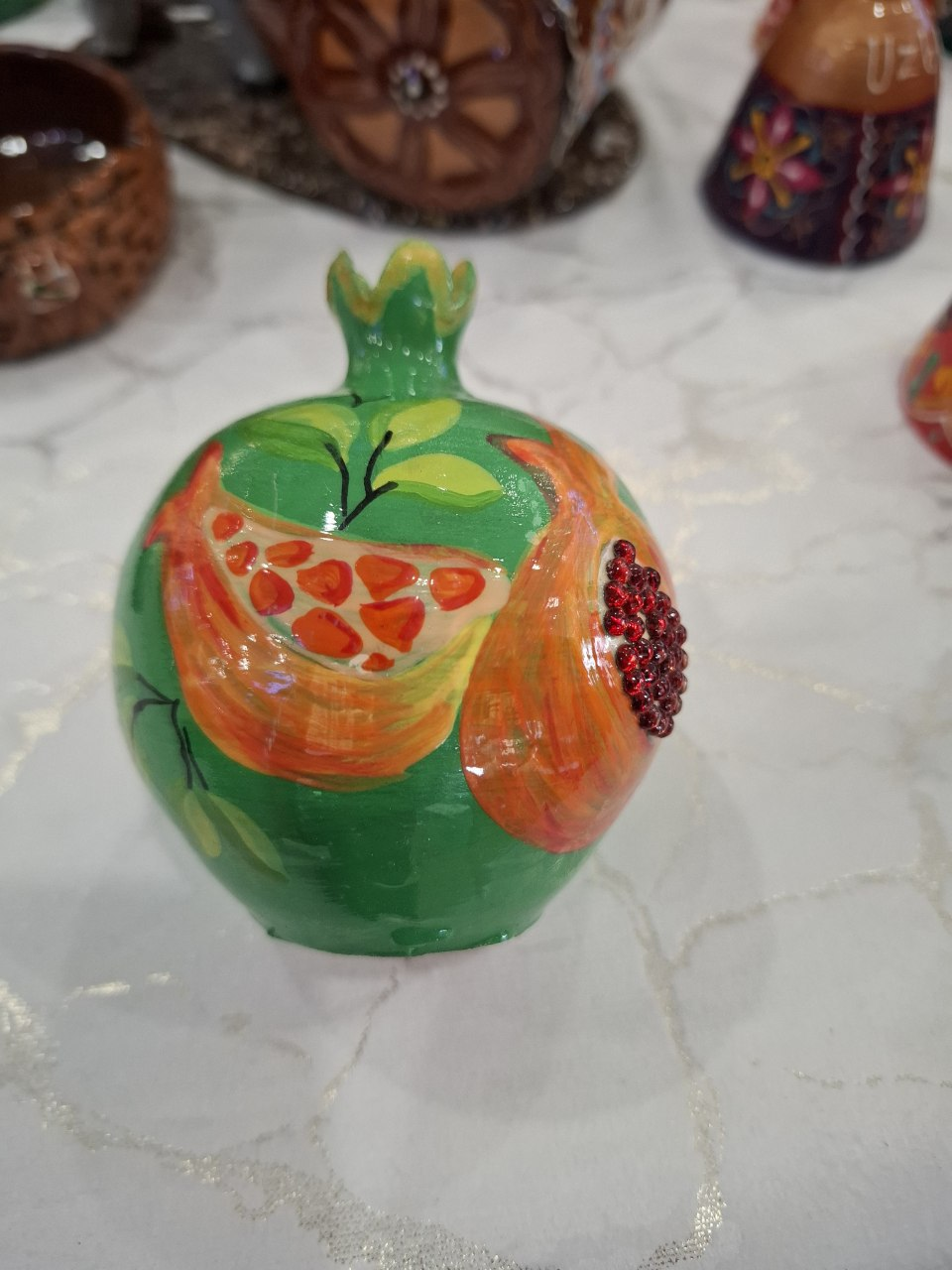 The pomegranate is a traditional symbol of family and fertility in Uzbek culture, representing abundance and many children. This decorative piece reflects these cultural meanings and is created with careful attention to traditional craftsmanship.