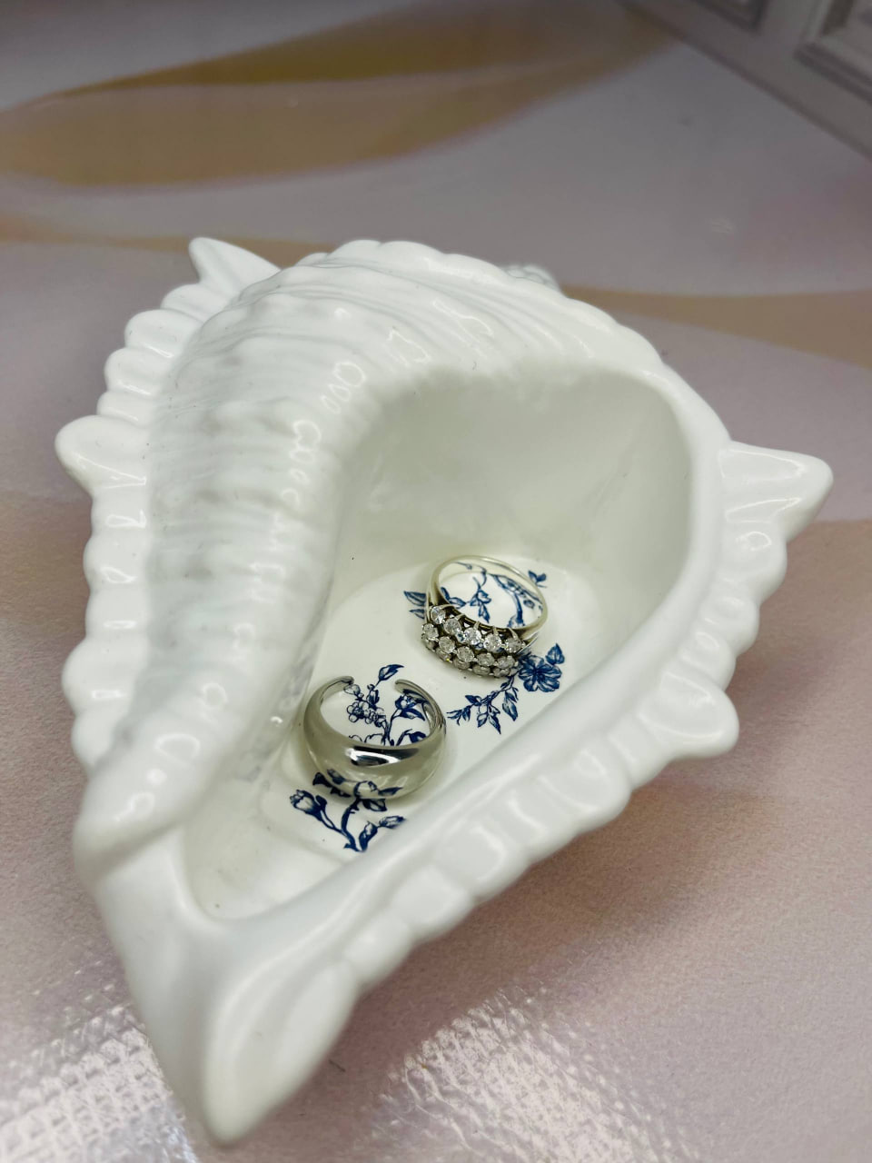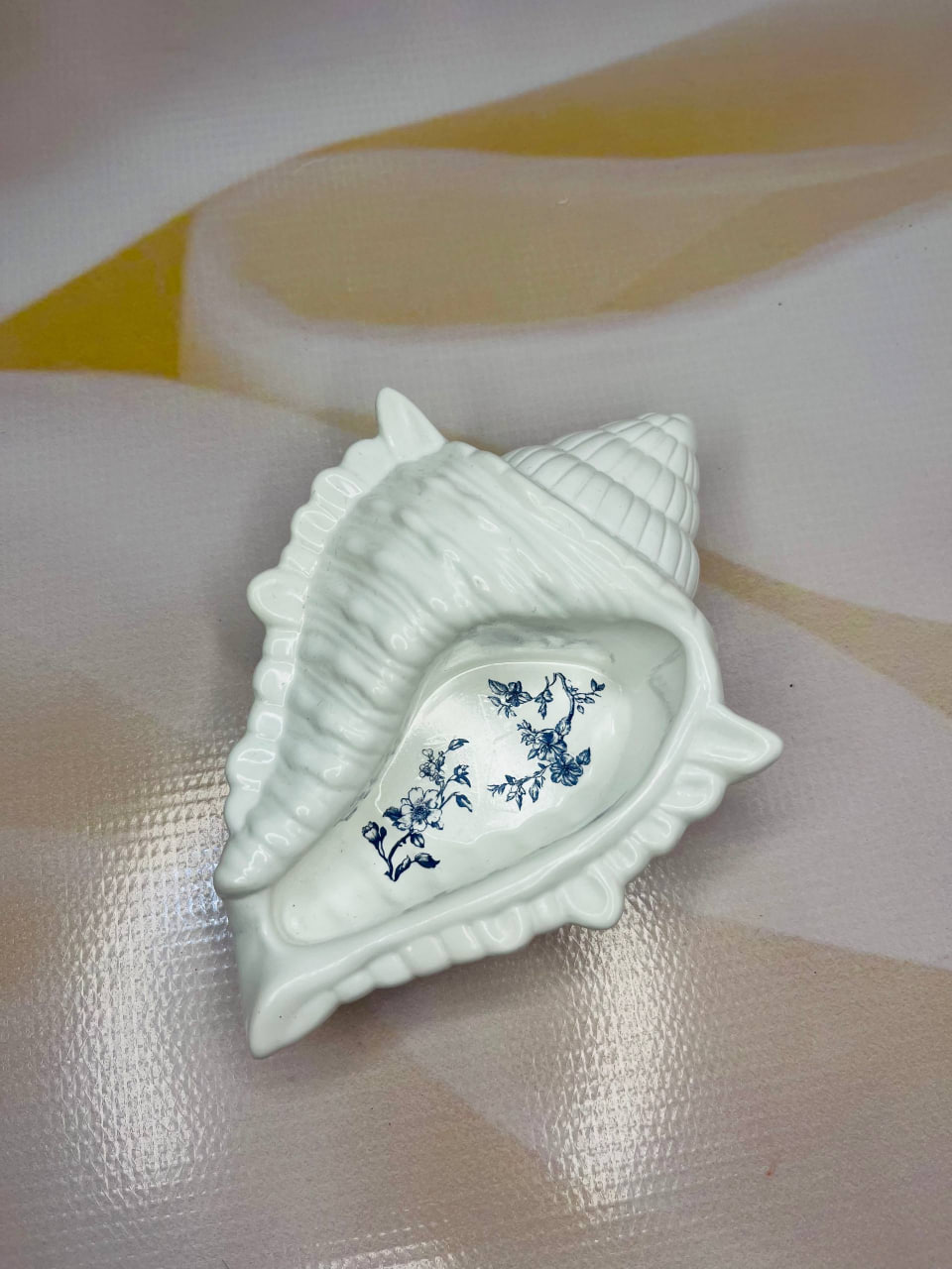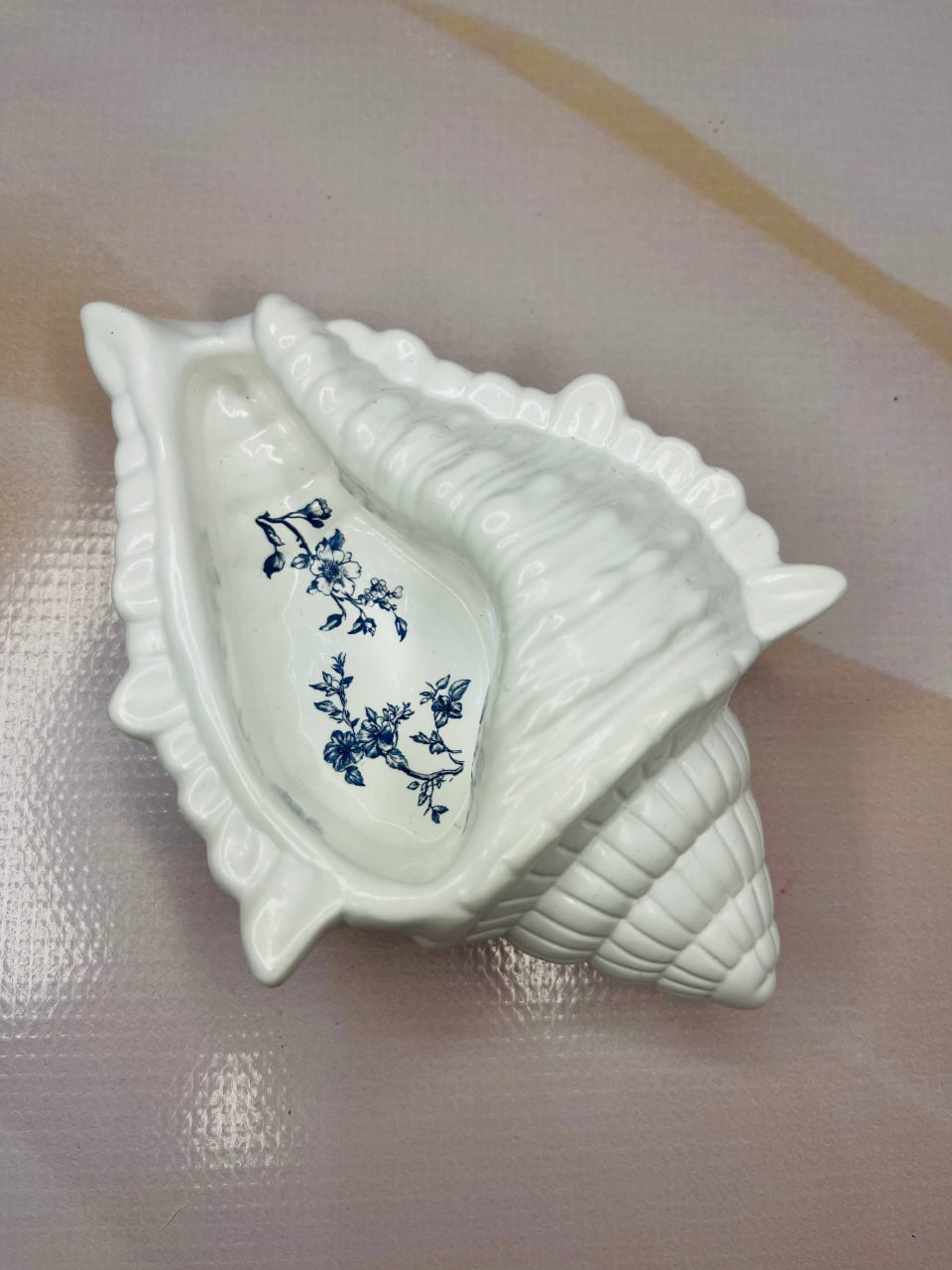 A handcrafted decorative tray shaped like a seashell and decorated with elegant patterns. The soft white color gives the piece a clean and modern look, making it a beautiful accent for home interiors.