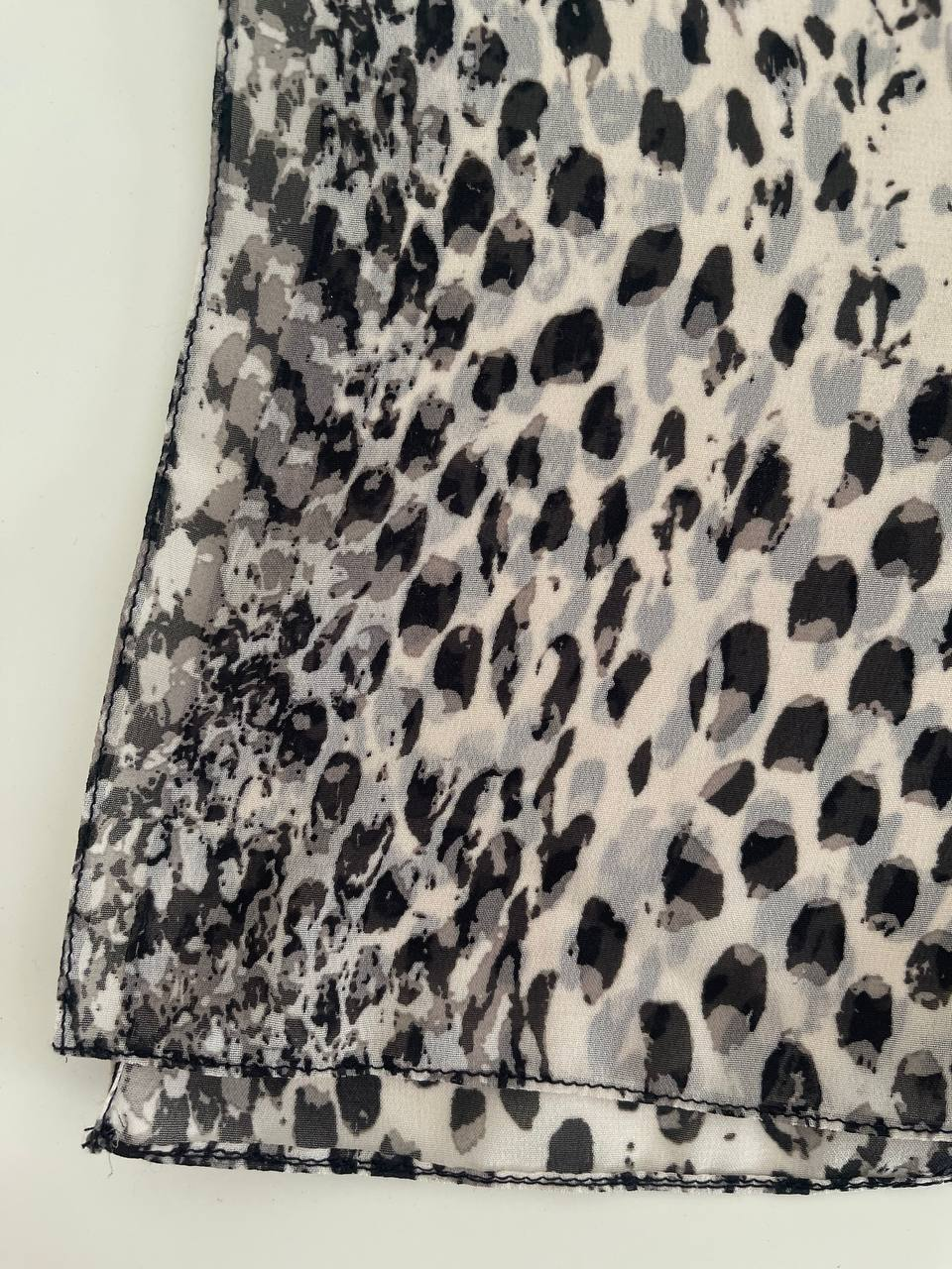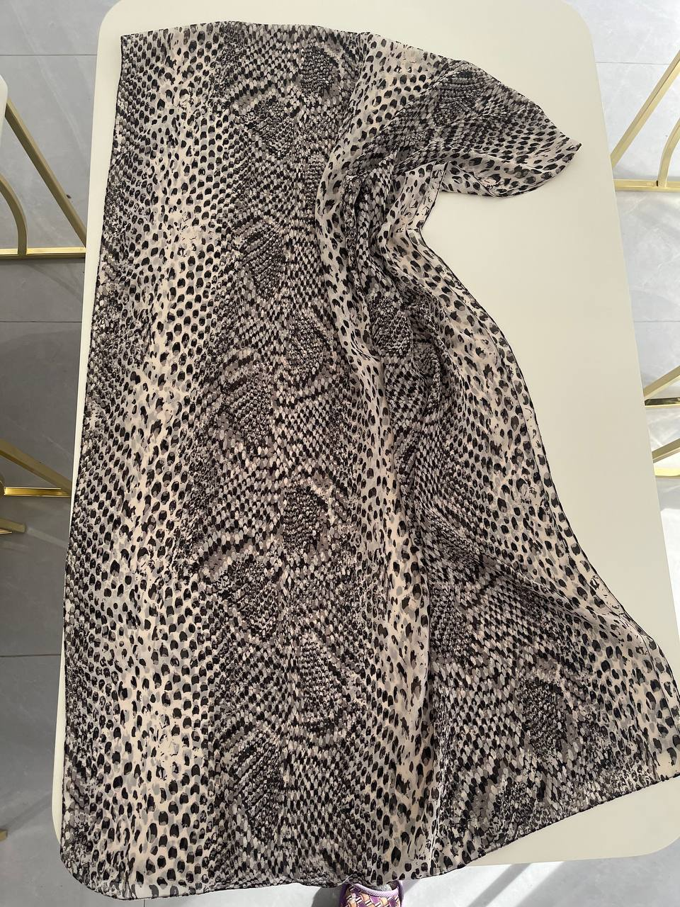 This stylish chiffon scarf features a beautiful animal-inspired pattern with a mix of leopard and snake print designs in neutral beige, black, and grey tones. Made from lightweight and breathable fabric, it feels soft on the skin and drapes gracefully.