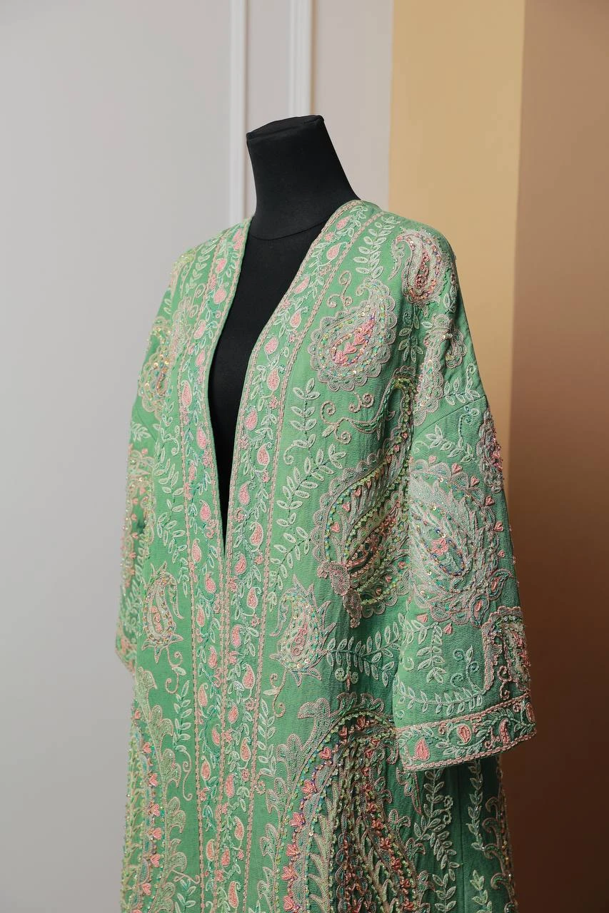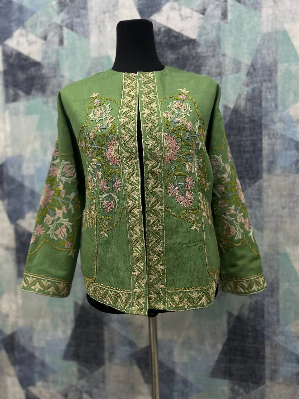 This exquisite piece is a hand-crafted silk suzani, meticulously embroidered with silk thread floral designs. Adorned with Japanese beads for added elegance. The lining is made from ikat shohi adras, providing a luxurious finish.