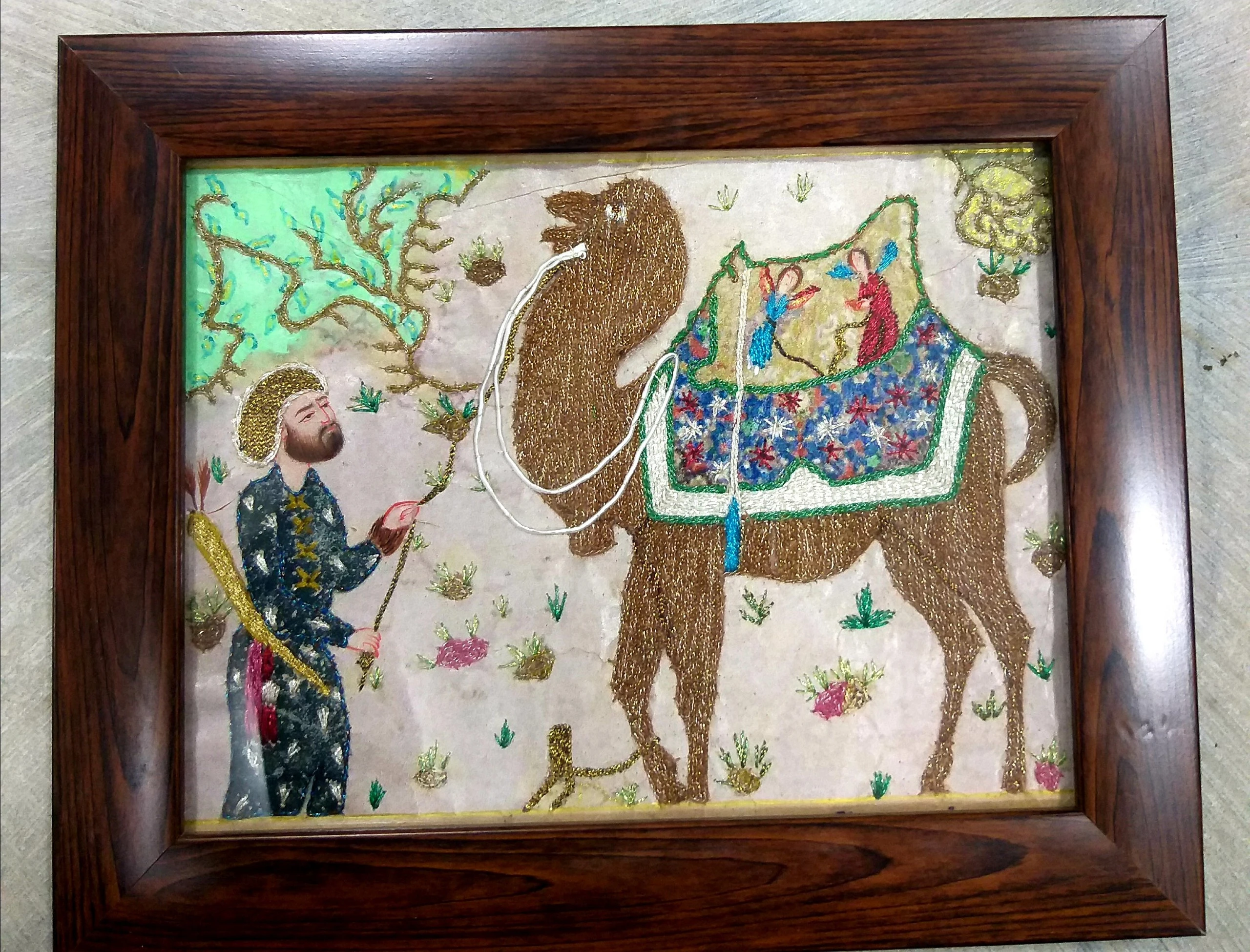 This is a 100% handmade and hand-painted artwork created in the traditional Uzbek and Central Asian miniature painting style, featuring detailed cultural storytelling and decorative motifs. The central subject is a camel covered with a richly patterned saddle blanket, decorated with floral and geometric designs in shades of blue, green, red, and gold accents. Beside the camel stands a traditional Uzbek traveler or merchant figure, wearing a long cultural robe with gold-highlighted details and a classic head wrap or cap inspired by Central Asian heritage clothing. The figure appears to be holding a stringed instrument or long traditional object, emphasizing the cultural character of the scene. The background includes soft pastel desert and nature tones, combined with delicate hand-painted decorative elements such as plants, hills, and ornamental accents. The artwork is enclosed behind clear protective glass and framed in a dark polished wooden rectangular frame, providing durability, preservation, and a classic decorative look suitable for wall display.