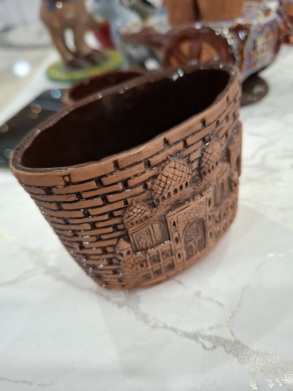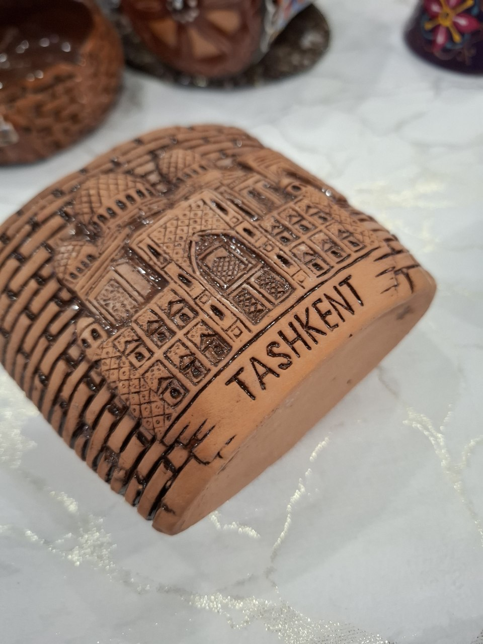 A handcrafted ceramic decorative piece featuring an engraved architectural design inspired by traditional Uzbek motifs. The word “TASHKENT” is carefully carved into the surface, making it a meaningful souvenir that reflects the cultural heritage and historic beauty of the city.