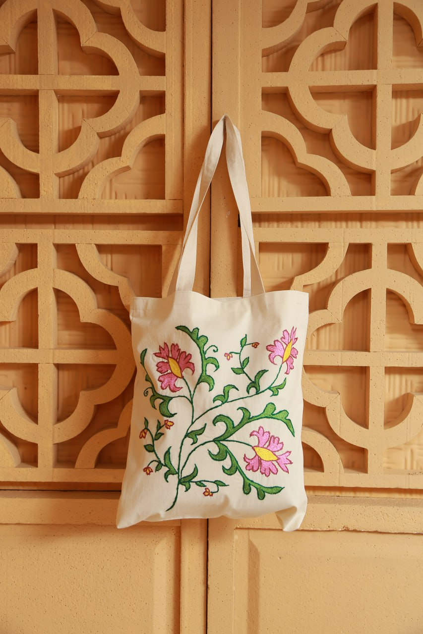 A handcrafted cotton tote bag decorated with delicate floral embroidery inspired by traditional Uzbek patterns. The soft pink flowers and flowing green leaves create an elegant and natural design that reflects the beauty of Uzbek textile art.