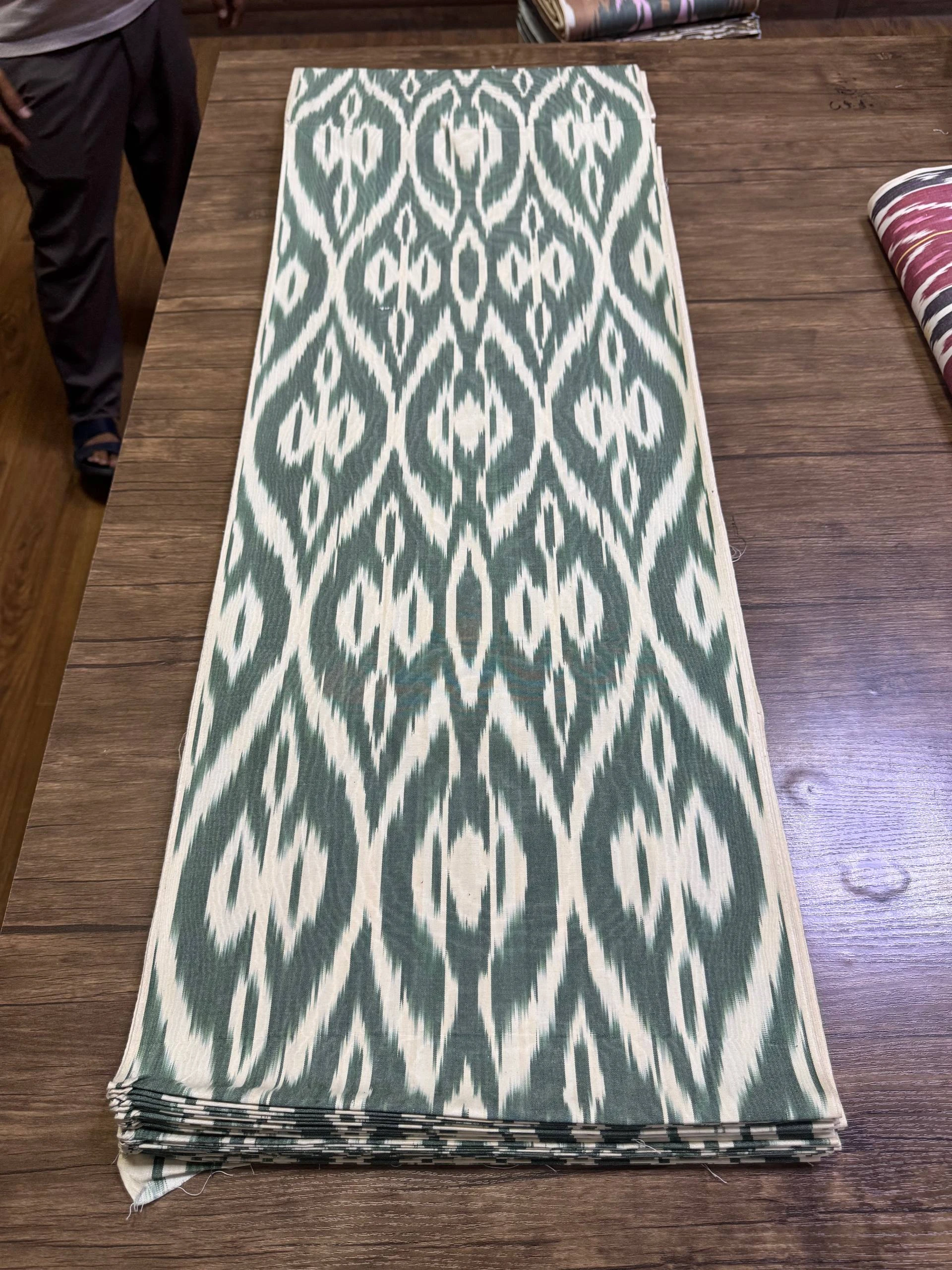 This refined handwoven Ikat cotton fabric features a harmonious geometric pattern in soft sage green and natural ivory tones. Produced using traditional resist-dyeing techniques before weaving, the design displays the distinctive blurred edges that characterize authentic Ikat craftsmanship.
