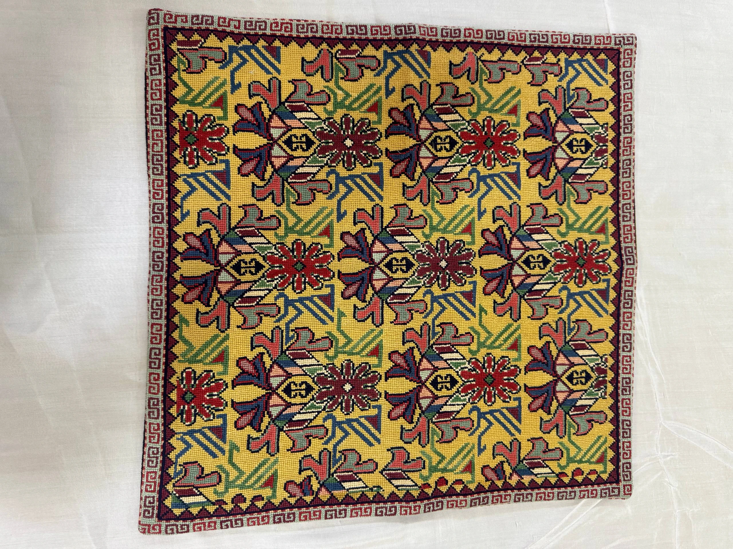 The intricate design combines deep red, emerald green, navy blue, ivory, and soft pink tones, creating a bold yet balanced visual impact. Each motif is carefully woven to reflect cultural symbolism associated with protection, prosperity, and continuity. The decorative border, finished with a classic Greek key pattern, frames the textile with refined elegance.