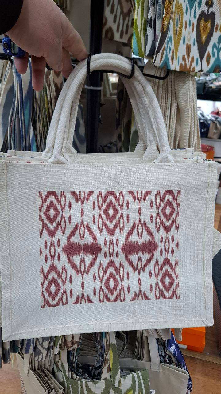 This stylish canvas tote bag features a traditional ikat-inspired pattern, reflecting the rich textile heritage of Uzbekistan. Designed with a minimalist yet cultural aesthetic, this bag combines modern functionality with authentic Central Asian artistry.