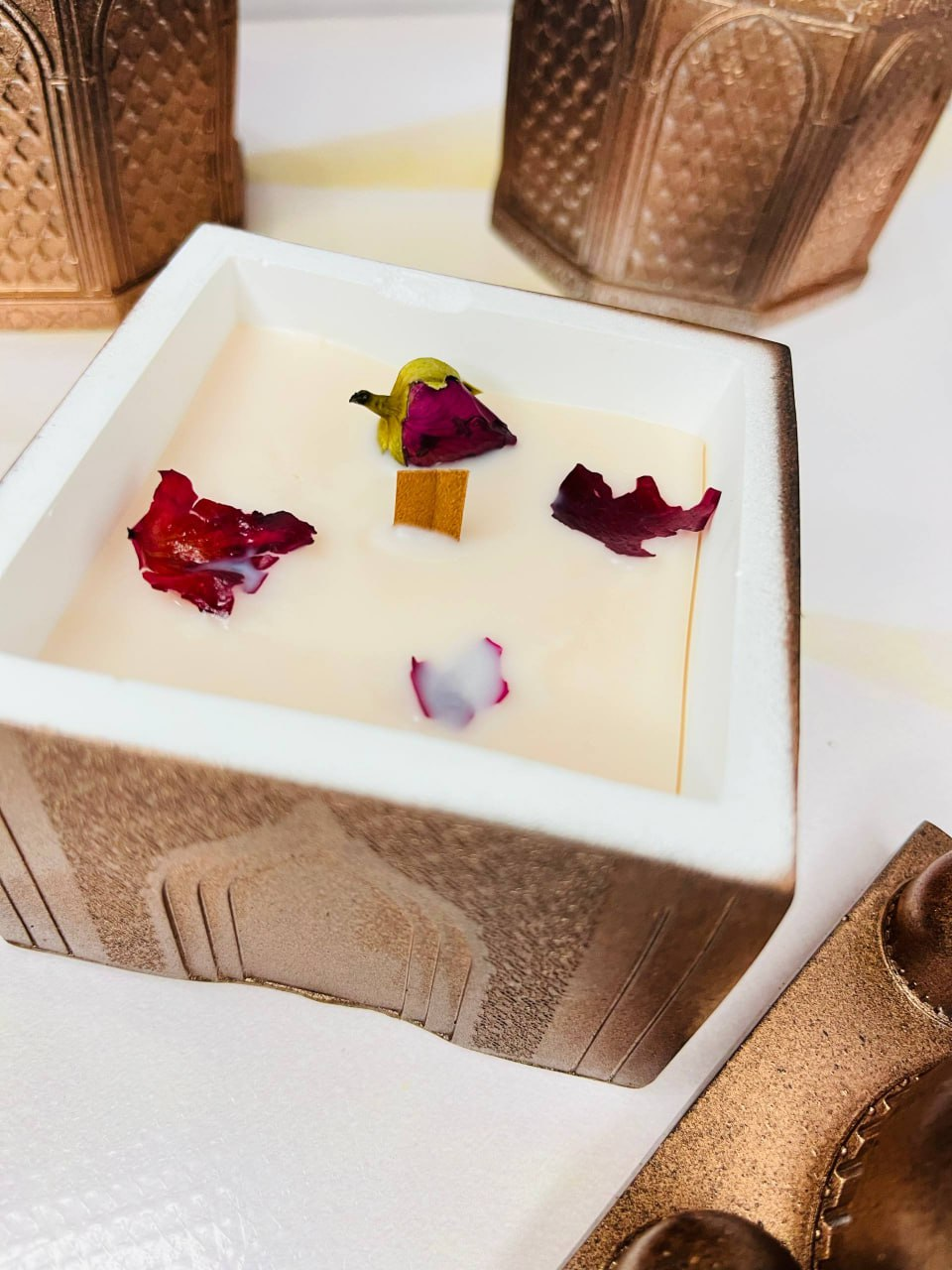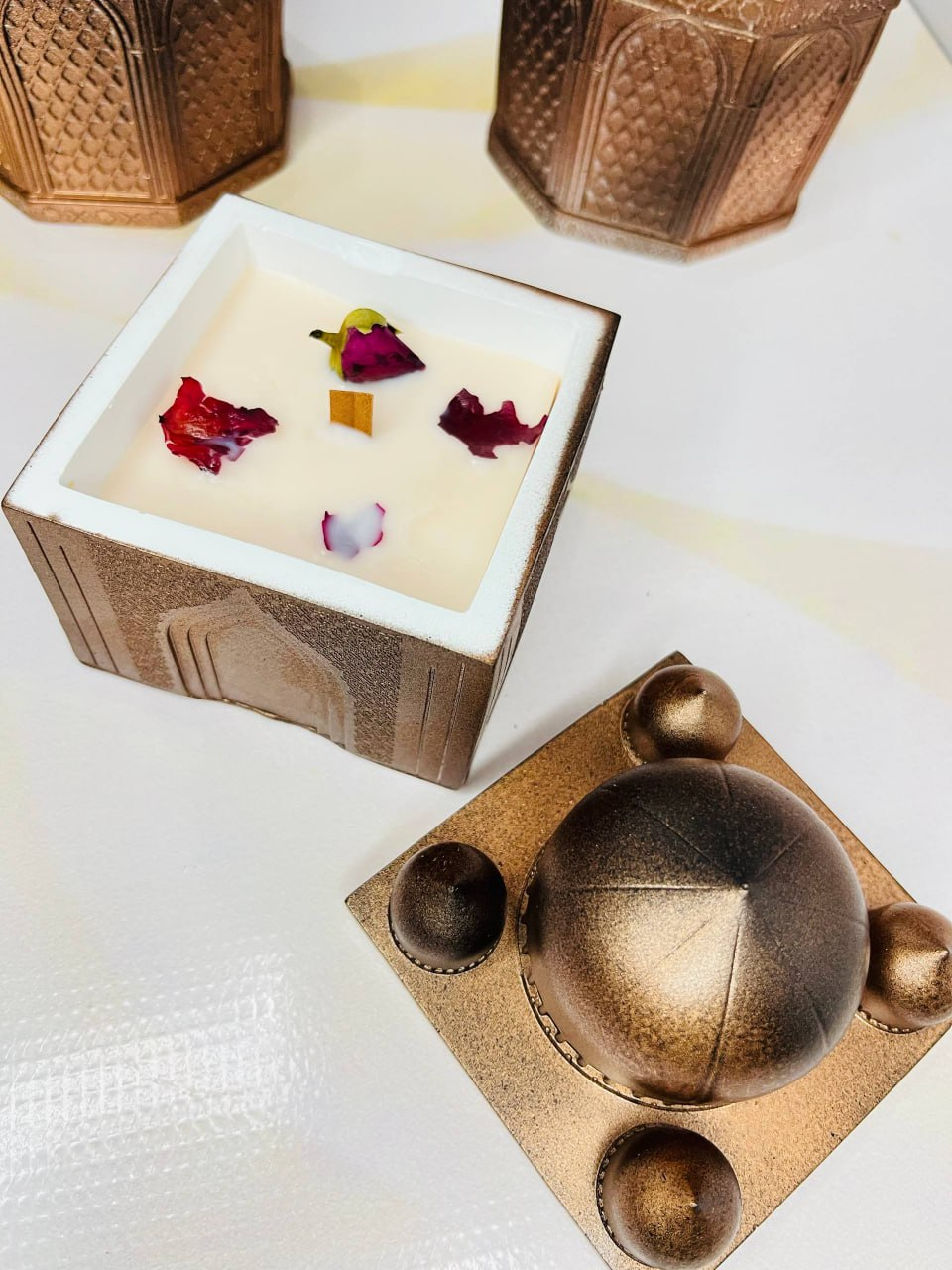A handcrafted decorative piece that combines both a jewelry box and an aroma candle. The elegant design makes it a beautiful decorative element for home interiors while also being practical for storing small items.