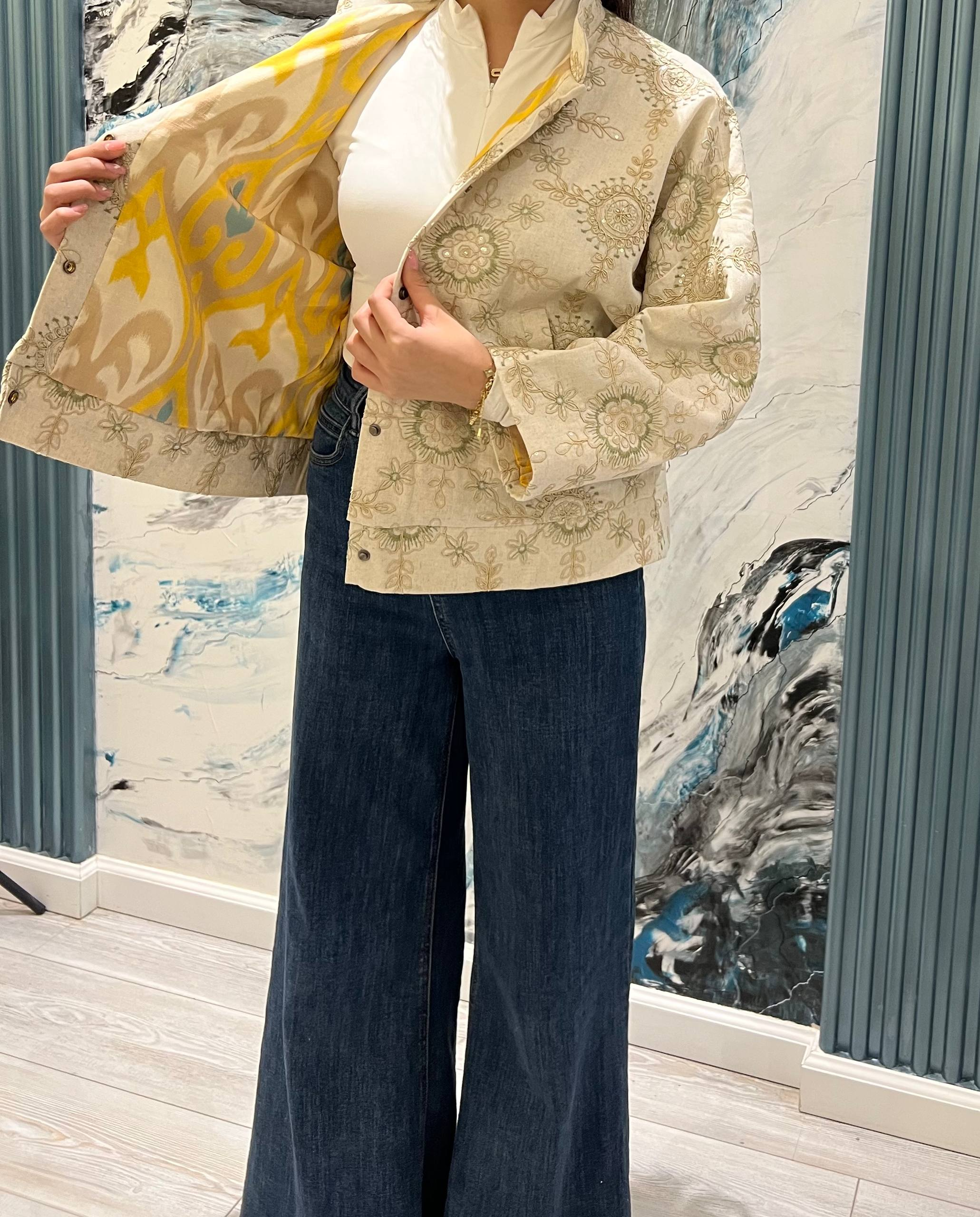 Discover the Premium Lion jacket designed with an elegant beige floral pattern, featuring high-quality Italian lining for superior comfort and durability.