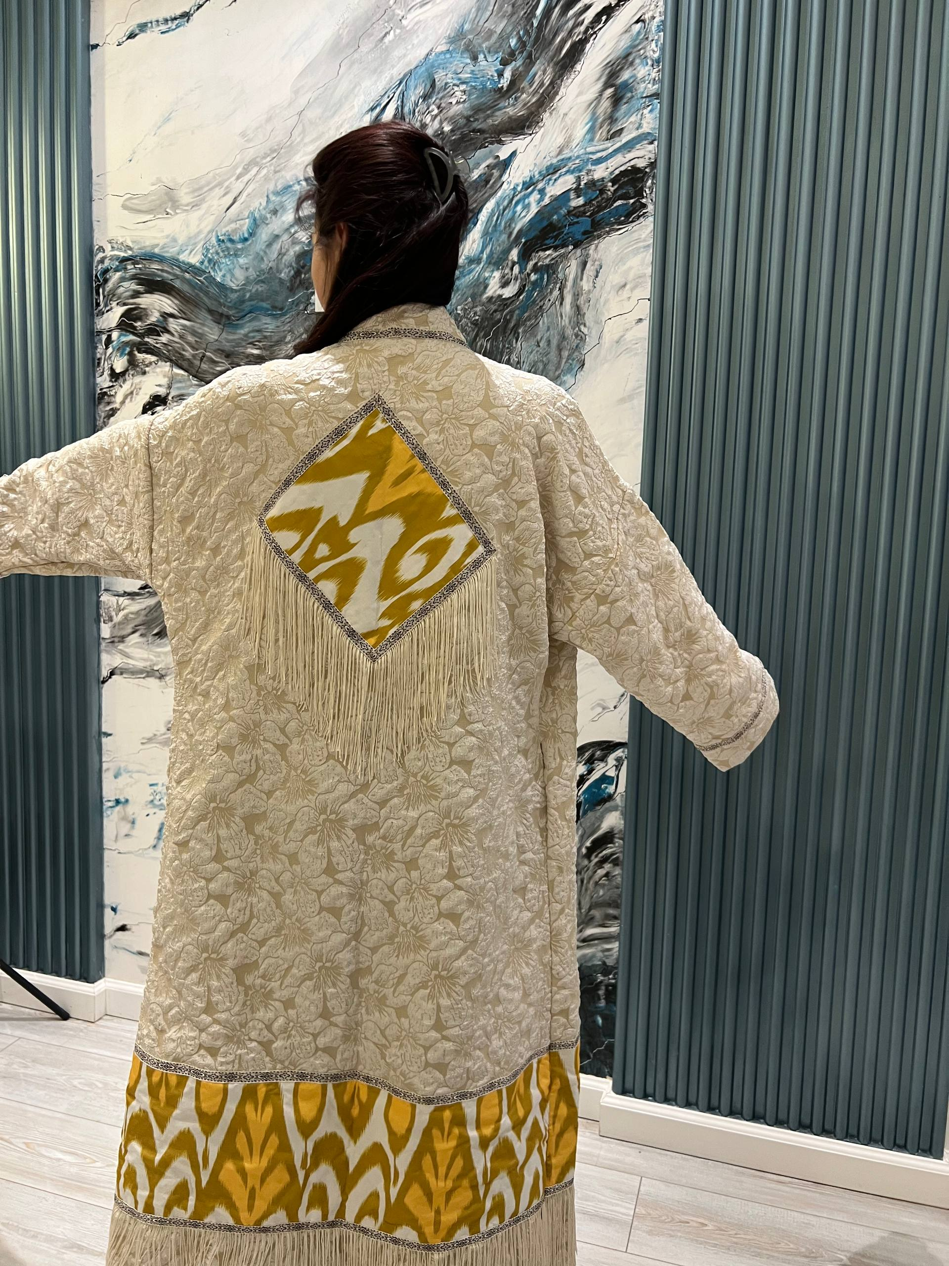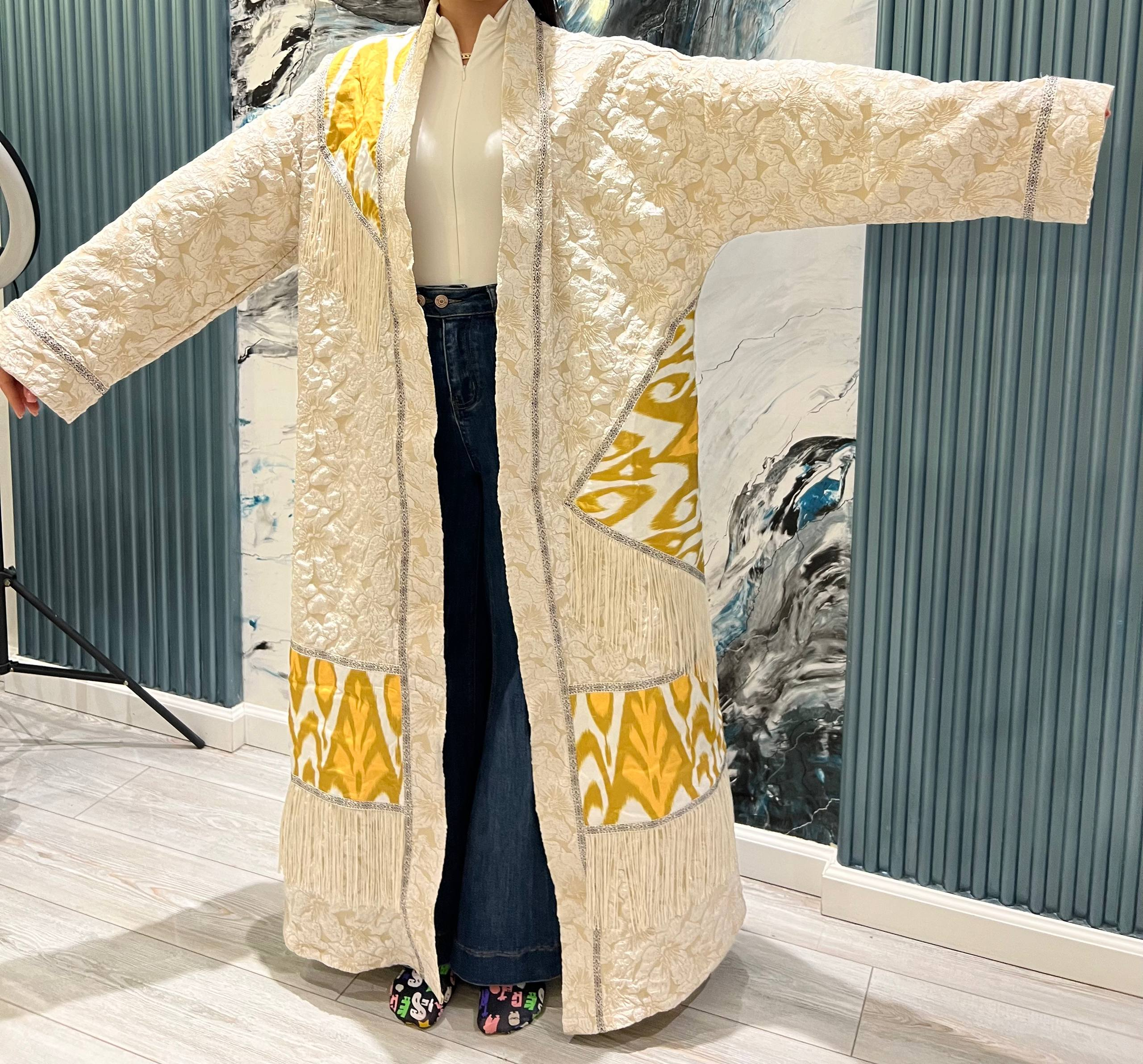 This stunning long coat features a unique blend of luxury and modern fashion, designed with: