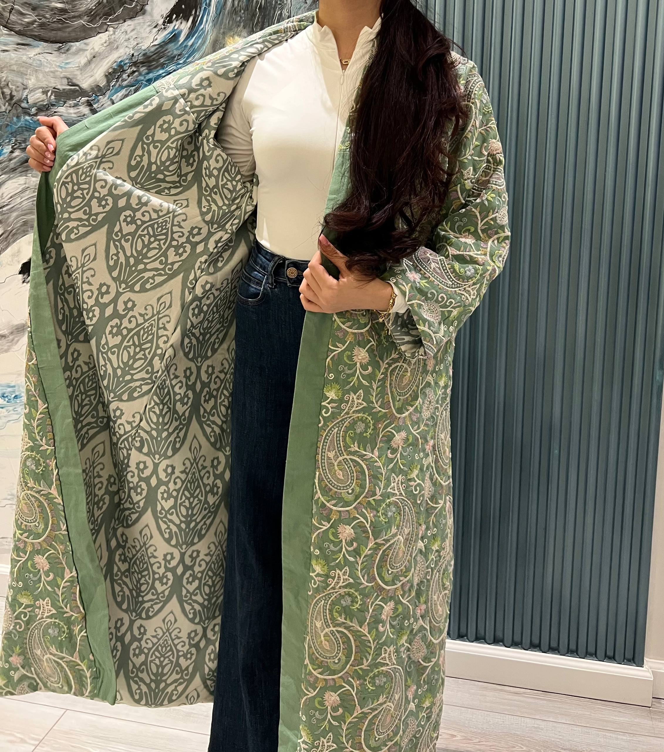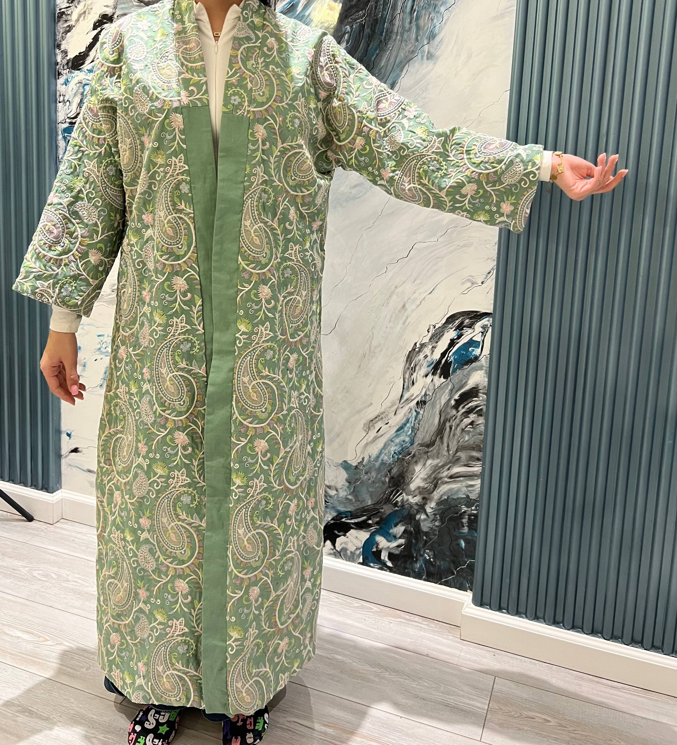 Experience elegance with the Lion Long Coat, featuring a refined green base adorned with intricate paisley embroidery. This coat offers a luxurious and sophisticated look, perfect for various occasions.