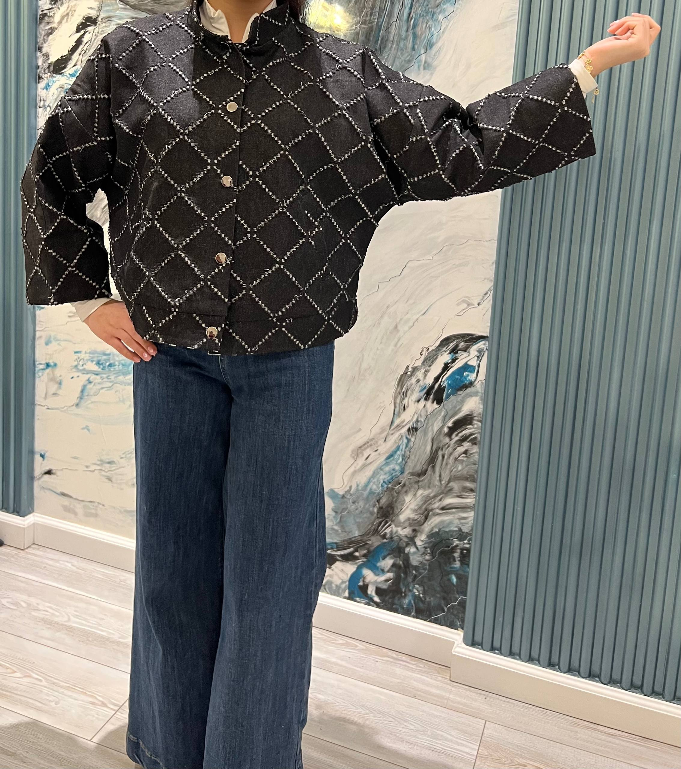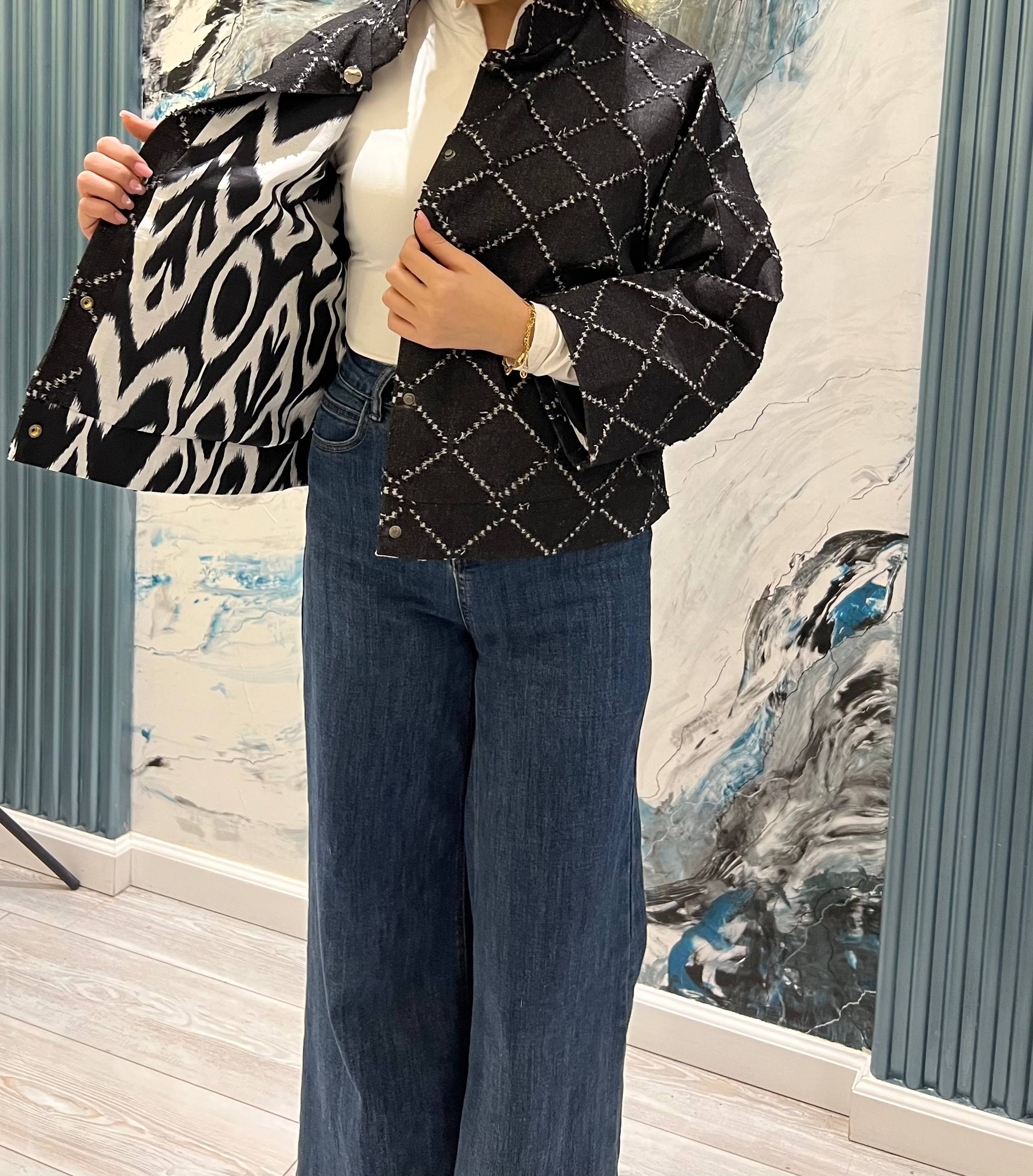 Trendy Lion reversible jacket featuring a modern black quilted design on one side and a bold ikat pattern on the other. This versatile piece offers two stylish looks in one, perfect for everyday wear and fashion-forward outfits.