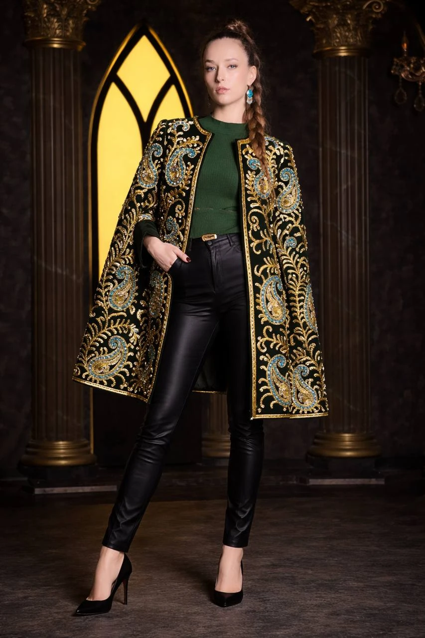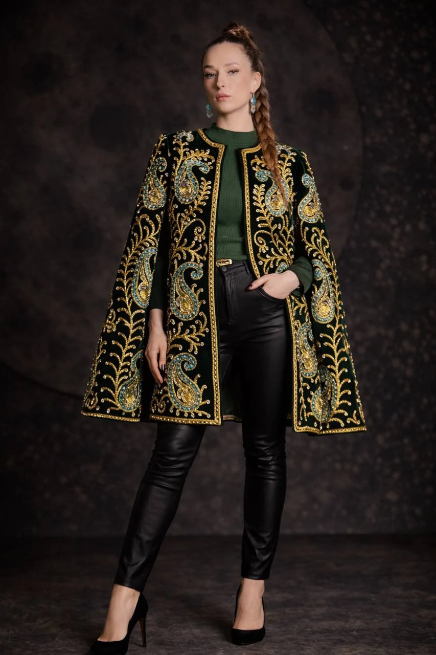 This chapan is crafted with meticulous hand embroidery, highlighting a clean and well-defined silhouette. Every detail is carefully executed, reflecting precision, balance, and true artisanal craftsmanship.