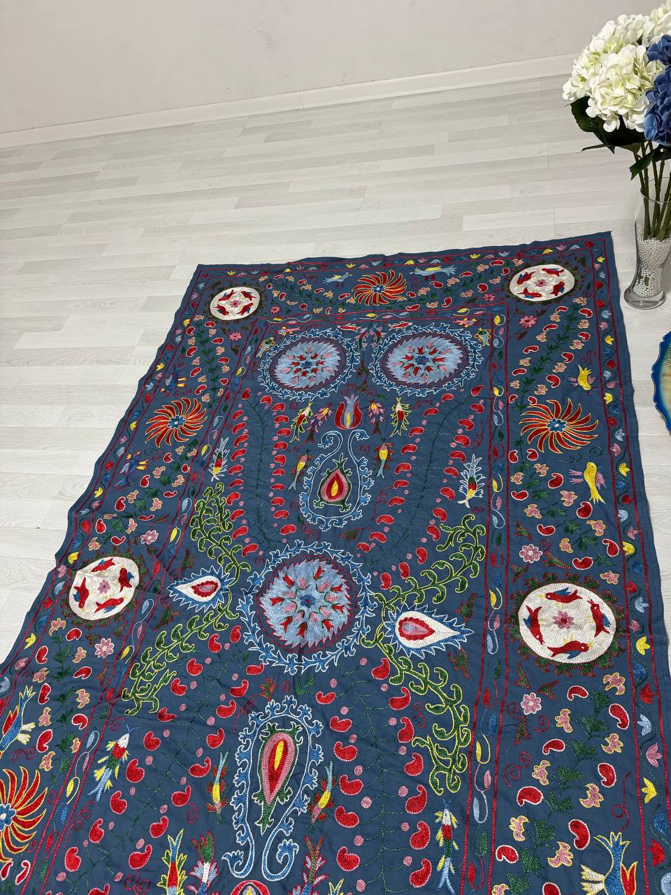 The embroidery is fully hand-stitched using a traditional hook technique, showcasing skilled craftsmanship and careful attention to detail.
