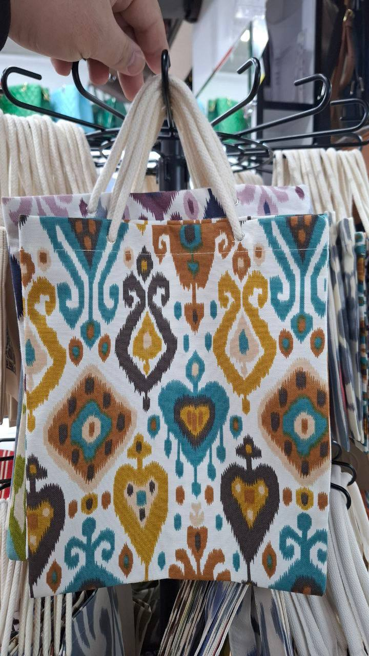 This vibrant mini tote bag features a colorful ikat-inspired ethnic pattern, reflecting the rich artistic traditions of Central Asian textiles. Crafted from durable canvas fabric, this eco-friendly mini shopper combines cultural heritage with modern practicality.