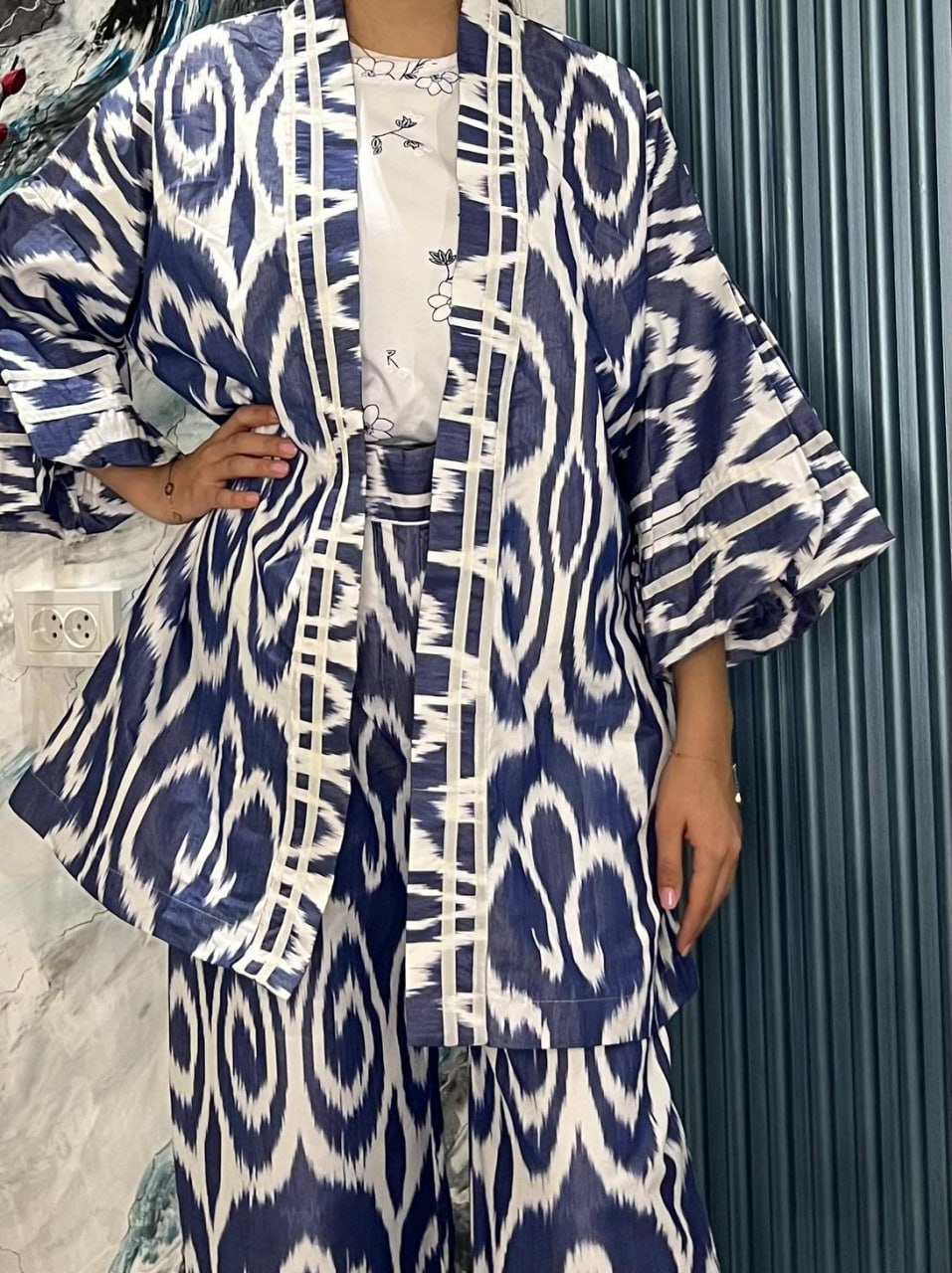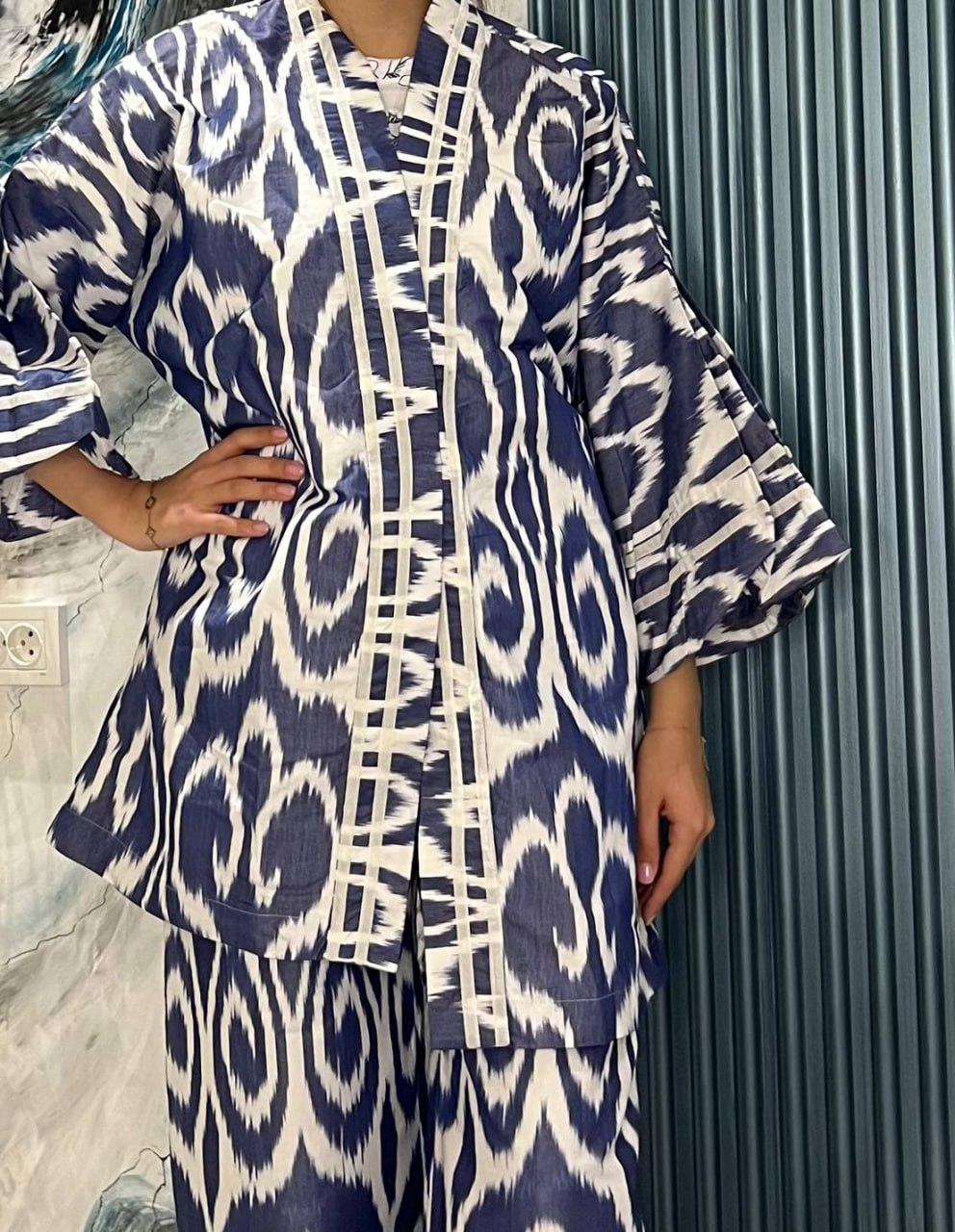 Stylish Miramir Atlas two-piece set featuring a classic blue and white ikat pattern. The outfit includes: