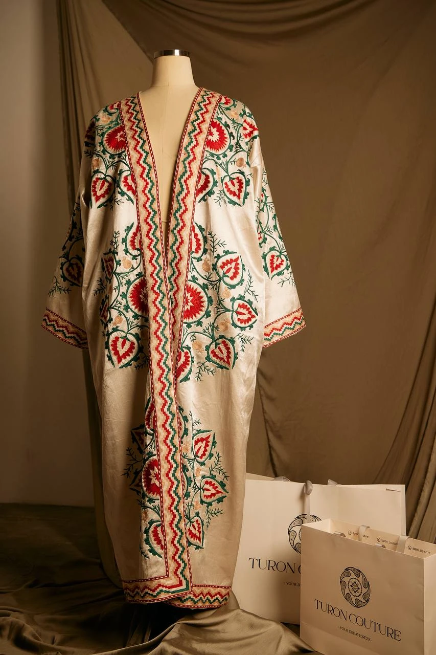 Each piece is fully hand-embroidered with natural silk threads by skilled artisans, making every chapan unique. The combination of traditional Suzani craftsmanship and modern designer silhouette transforms the garment into a wearable work of art.