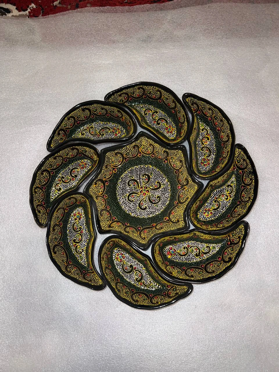 This collection showcases premium handcrafted ceramic plates featuring traditional Uzbek artisan techniques. The designs include leaf-inspired segmented shapes and classic round forms, all with symmetrical, layered ornamental compositions. Central motifs consist of Uzbek paisley, mandala-style florals, and nature-inspired blossoms. Plates are intricately hand-painted with dotwork and raised relief details, bordered with multi-layer ethnic frames. Colors include deep glossy black or cobalt-blue, with accents in gold, yellow, red, orange, turquoise, indigo, and green. Hand-molded, carved, and painted from high-quality ceramic clay, each plate is unique. While suitable for serving dry or warm foods, they are best used for decorative purposes in home interiors, cultural displays, or as premium heritage gifts.