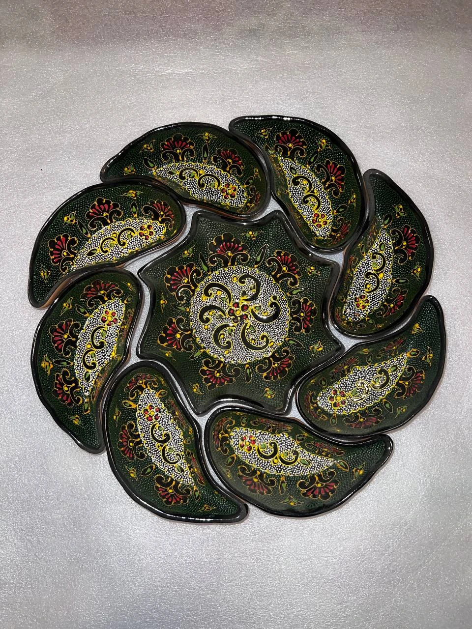 These images feature a set of exquisite handcrafted Uzbek ceramic decorative plates, known as lagan, crafted with traditional artisan techniques. The collection includes plates in leaf-inspired segmented shapes and classic round forms with symmetrical, layered ornamental designs. Central motifs include Uzbek paisley (buta), mandala-style florals, and nature-inspired blossoms, decorated with intricate hand-painted dotwork (nuqta naqsh) and raised relief details. The borders present multi-layer ethnic frames with islimi (curved vine) and geometric accents. The plates come in round forms with scalloped artistic rims and multi-segment shapes resembling stylized leaves or petals, blending Uzbek heritage with modern decorative finishes. The color palette features deep glossy black or cobalt-blue base glazes, enhanced with gold, yellow, red, orange, turquoise, indigo, and green highlights. The background texture consists of dense artistic dotwork for a rich, premium handcrafted feel, with smooth, natural ceramic tones on inner surfaces. Made from high-quality ceramic clay, each plate is 100% hand-molded, hand-carved, and hand-painted, with a glossy protective glaze for durability and elegance. Every plate is unique with minor variations due to the handmade process. Suitable for dry or warm food serving, décor display, or cultural styling, these plates reflect the authentic artistic heritage of Uzbekistan, making them perfect for home decoration, cultural display, premium gifts, and table styling.