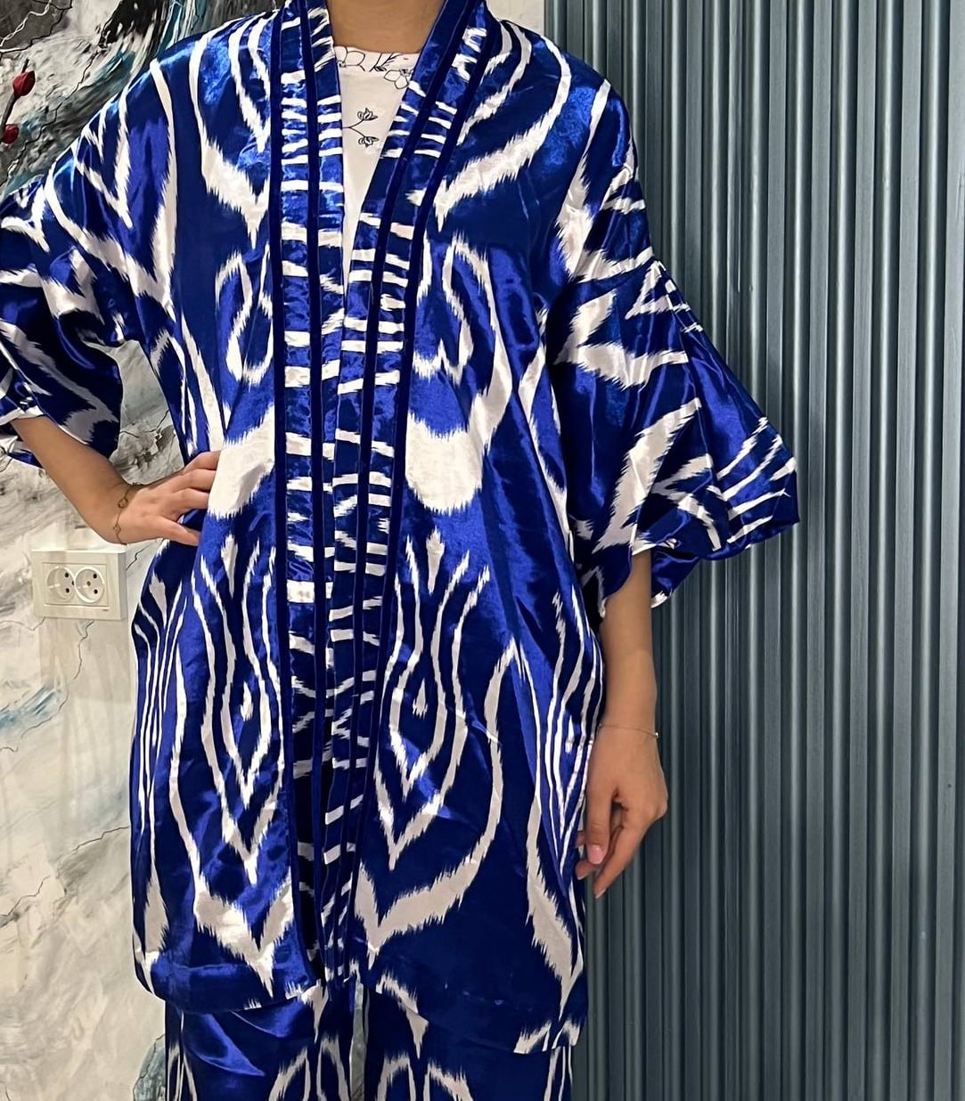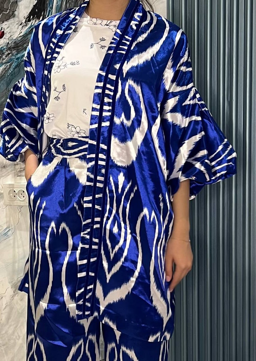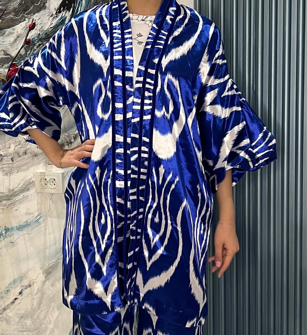 Discover the elegance of our premium silk Atlas ikat kaftan featuring a rich royal blue and white pattern, inspired by traditional Uzbek craftsmanship.