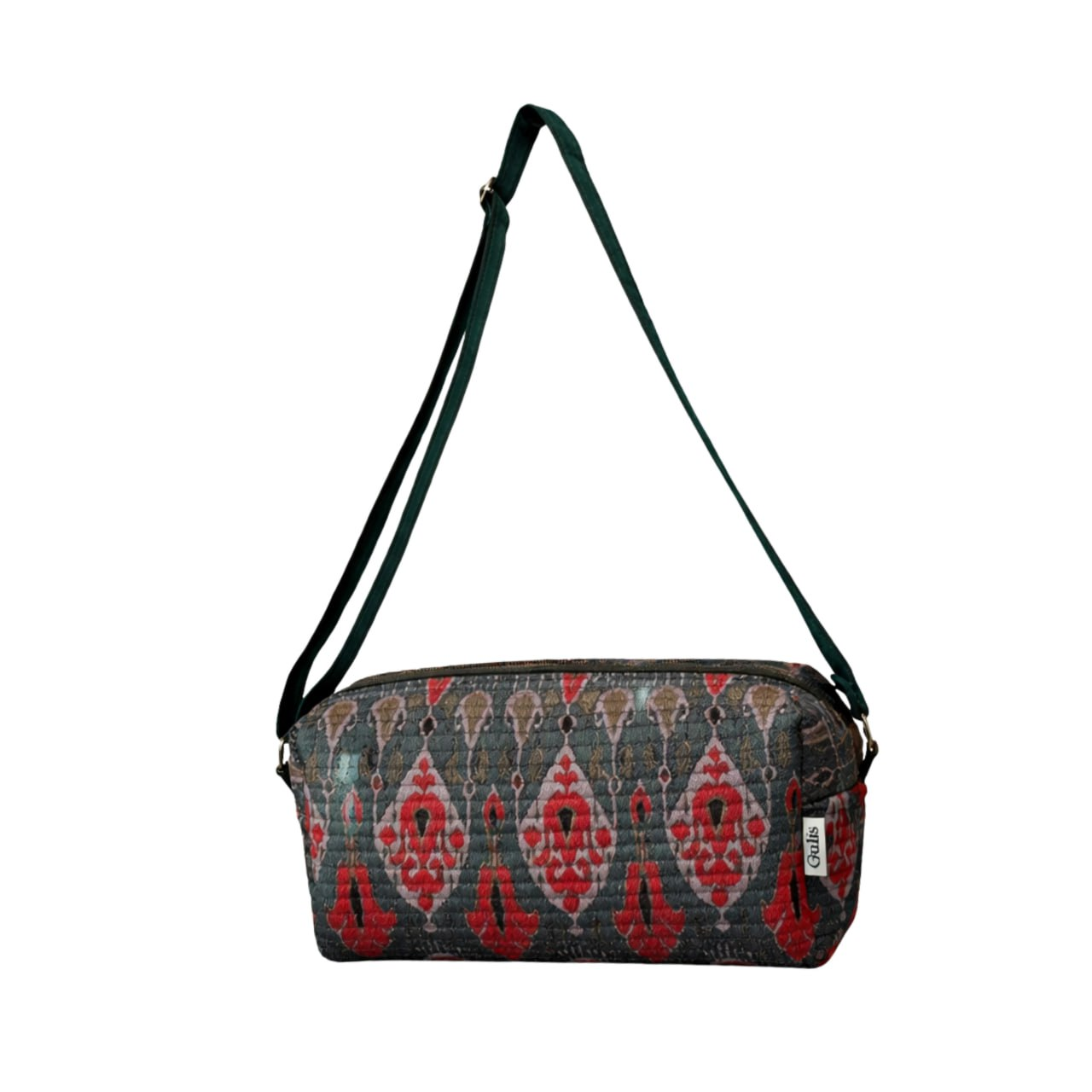 A stylish handmade crossbody bag featuring a traditional ikat ornament. Its compact shape, neat stitching, and rich, vibrant tones create a bright yet refined look. The long adjustable strap allows it to be worn comfortably across the body or on the shoulder.