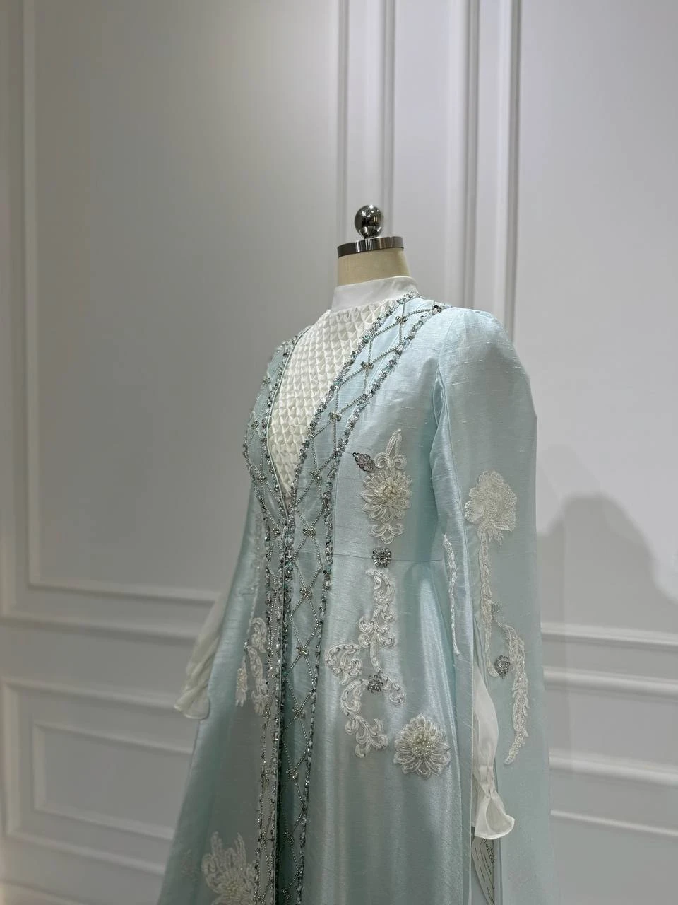 The “Sultaniya” kaftan in a gentle soft-blue tone embodies the calm elegance of royal beauty. The color feels like a whisper — serene, light and poetic — allowing the texture and craftsmanship to take center stage. Created entirely by hand, the piece carries emotional depth in every detail, where the rhythm of stitches reflects patience, mastery and heritage.