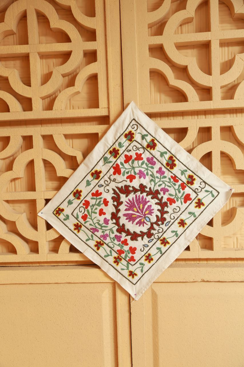 A traditional Suzani embroidery piece handcrafted with care and attention to detail. Made from cotton adras fabric, it reflects the rich heritage of Uzbek textile artistry and traditional decorative patterns.