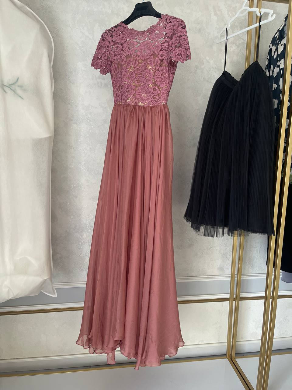 This dress offers a flattering fit and enhances the natural shape of the body, providing both elegance and confidence. The soft dusty-rose color adds a romantic and timeless charm.