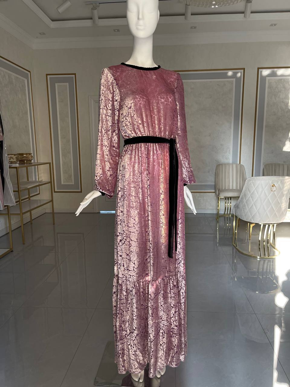 This elegant dress is made from high-quality velvet fabric, offering a soft, luxurious texture and a refined appearance. The rich sheen of the material adds sophistication, making it perfect for both special occasions and everyday elegance.