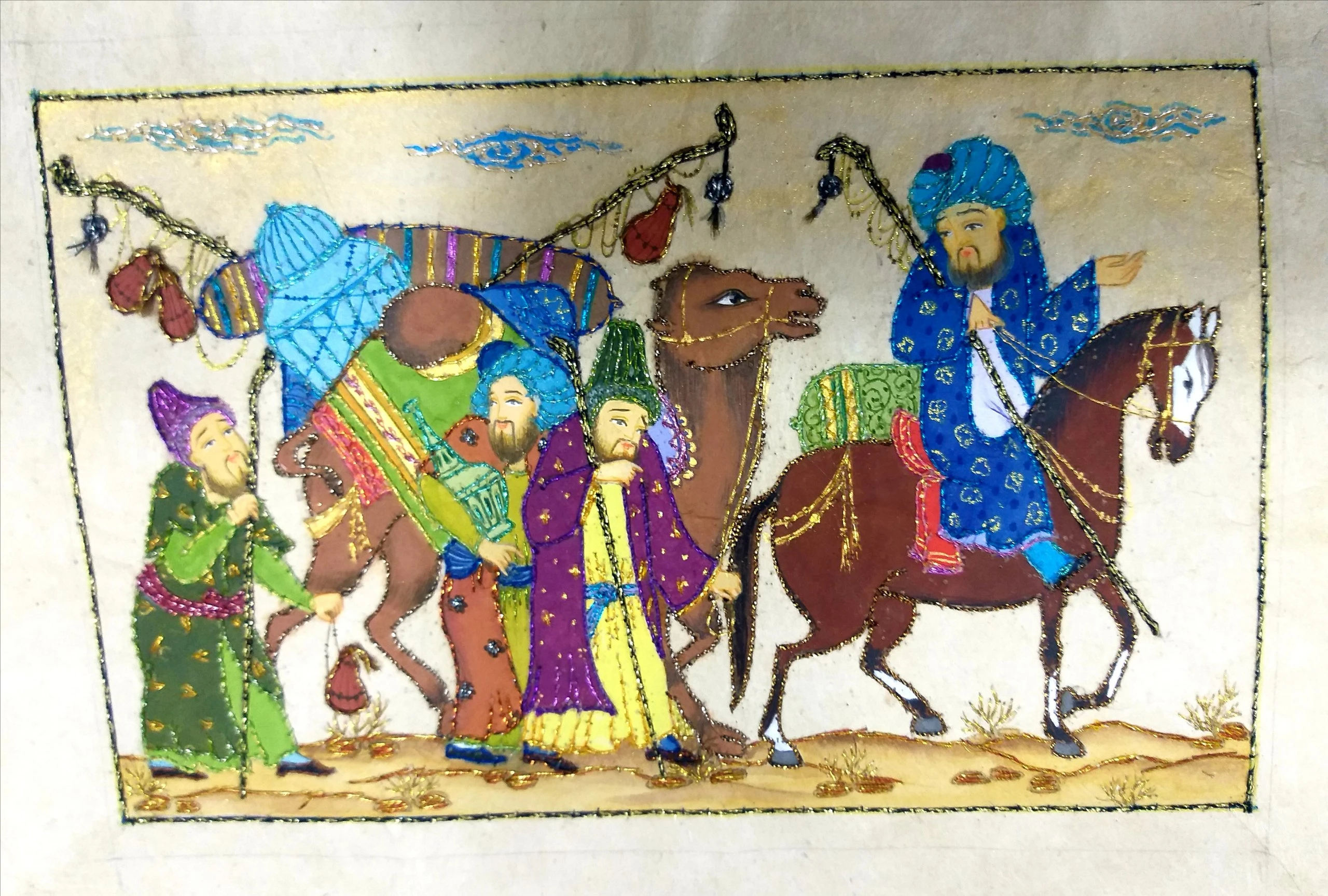 This is a 100% handmade and hand-painted Uzbek miniature artwork depicting a ceremonial royal caravan and horseback riders, inspired by Central Asian cultural heritage. The scene features several travelers wearing traditional Uzbek robes and headpieces in vibrant colors. The composition includes camels and horses with decorative saddle blankets. A rider holds a traditional instrument, showcasing movement and storytelling. The work includes gold-accented strokes, a hallmark of Uzbek miniature art. The background uses earthy tones with decorative sky patterns for a vintage look. It is framed in a dark, polished wooden frame with glass protection, ideal for wall display. This artwork represents heritage, travel, unity, and traditional Central Asian trade culture, designed in the classic Uzbek miniature storytelling art form. Highlights include its handmade nature, gold accents, and suitability for cultural collections and heritage gifting.