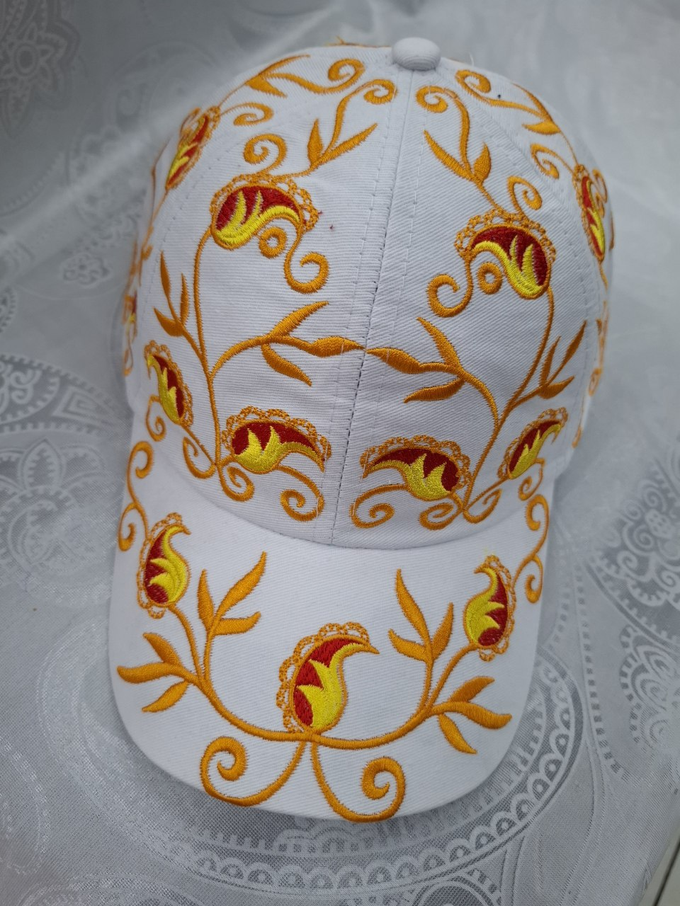 This white Uzbek embroidered cap is a beautifully crafted accessory that blends traditional artistry with modern fashion. Made from high-quality fabric, it features vibrant orange, red, and yellow floral embroidery inspired by authentic Central Asian patterns.