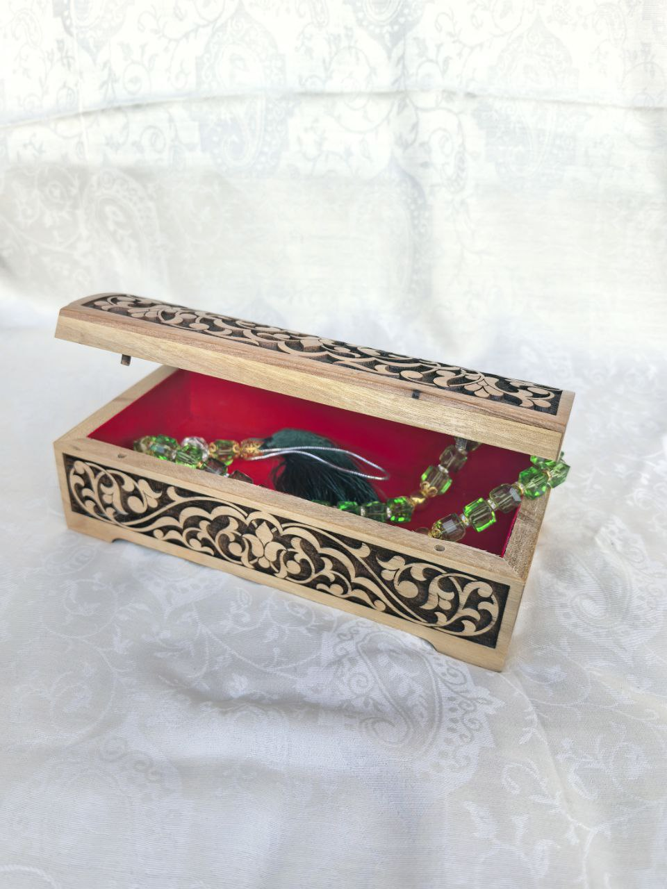 A wooden box designed for storing gold jewelry and valuable accessories. Practical and elegant, it provides a secure space to keep your precious items organized and protected.
