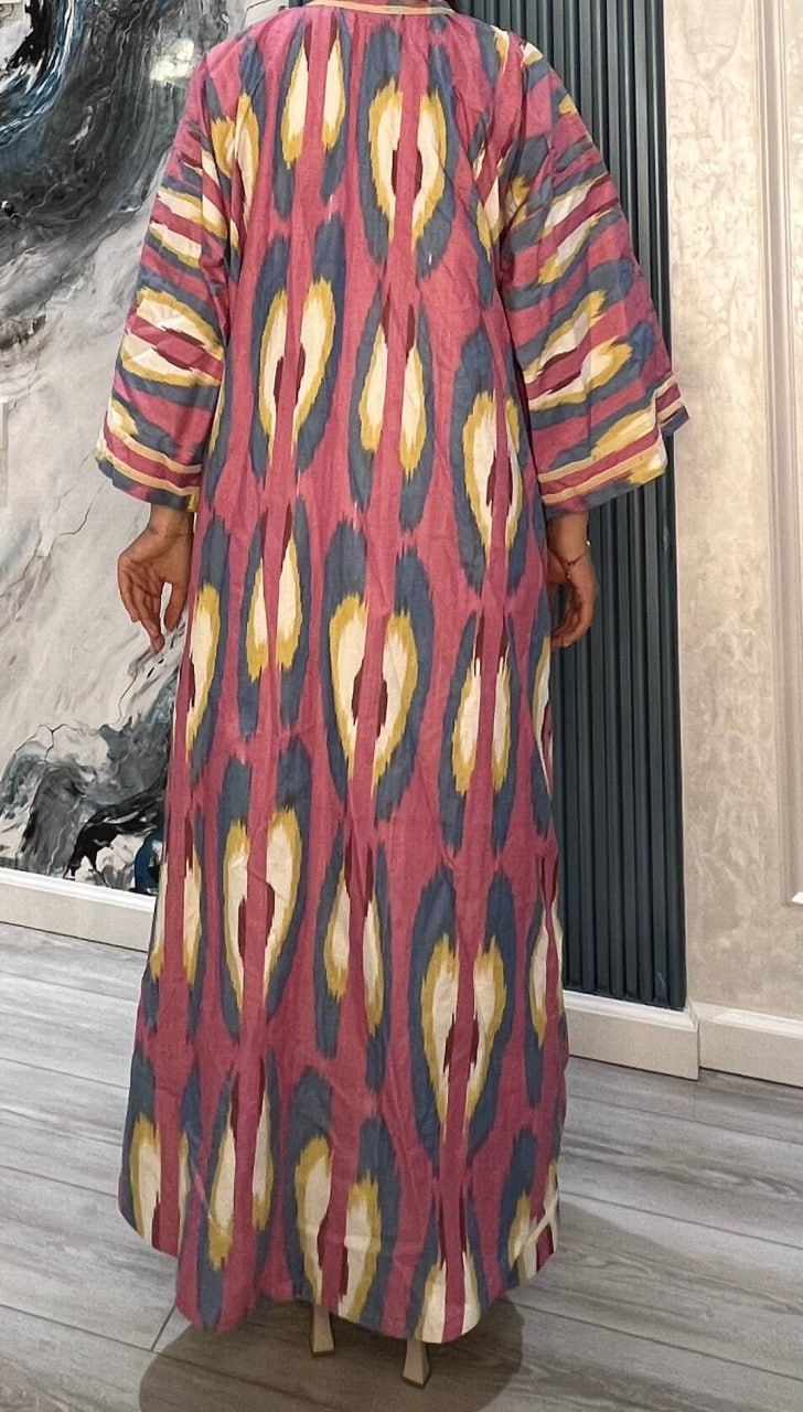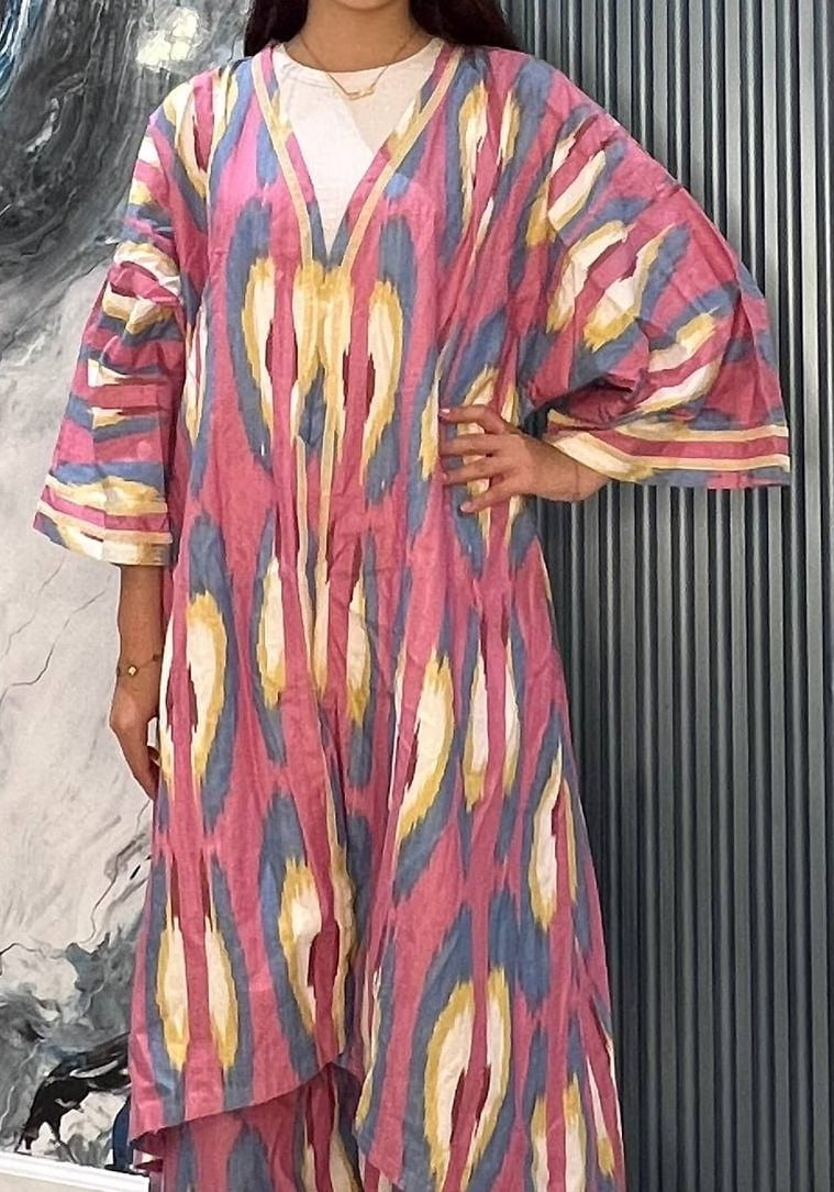 Trendy XB Atlas two-piece set made from premium ikat fabric in vibrant multicolor tones.