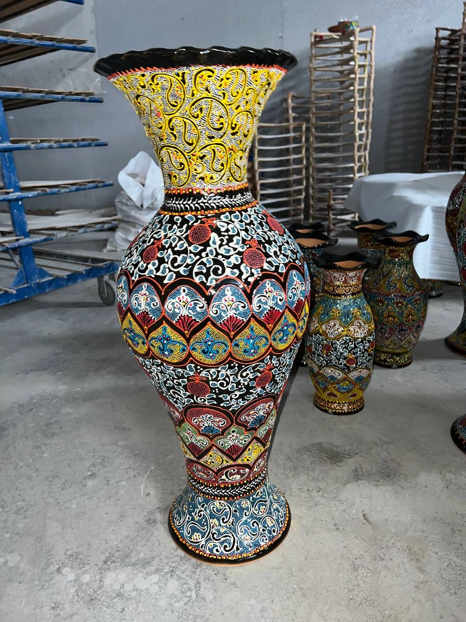 This is a premium handcrafted Uzbek ceramic decorative vase made using traditional artisan techniques. The vase features an elegant tapered neck, a wide patterned body, and a stable round ceramic base, giving it a graceful and balanced silhouette. The surface is richly decorated with traditional Uzbek ethnic ornaments, including paisley-style motifs, floral elements, and symmetrical mandala accents. The design uses a striking color palette of gold, turquoise, red, orange, black, and yellow, applied with highly detailed hand-painted dotwork and contour patterns. The top rim of the vase has a wave-shaped artistic finish, adding a refined handcrafted touch. Each ornament is carefully painted by hand, making every vase slightly unique in pattern precision and artistic expression. The ceramic material is durable, smooth to the touch, and suitable for: Home interior decoration Traditional or modern space styling Gifting with cultural value Display pieces for hotels, shops, offices, or museums This vase reflects the depth of Uzbek cultural heritage and craftsmanship, blending artistic tradition with premium aesthetic appeal. It is not only a decor item but also a symbol of authentic handmade art, created for those who value elegance and cultural identity in interior design.