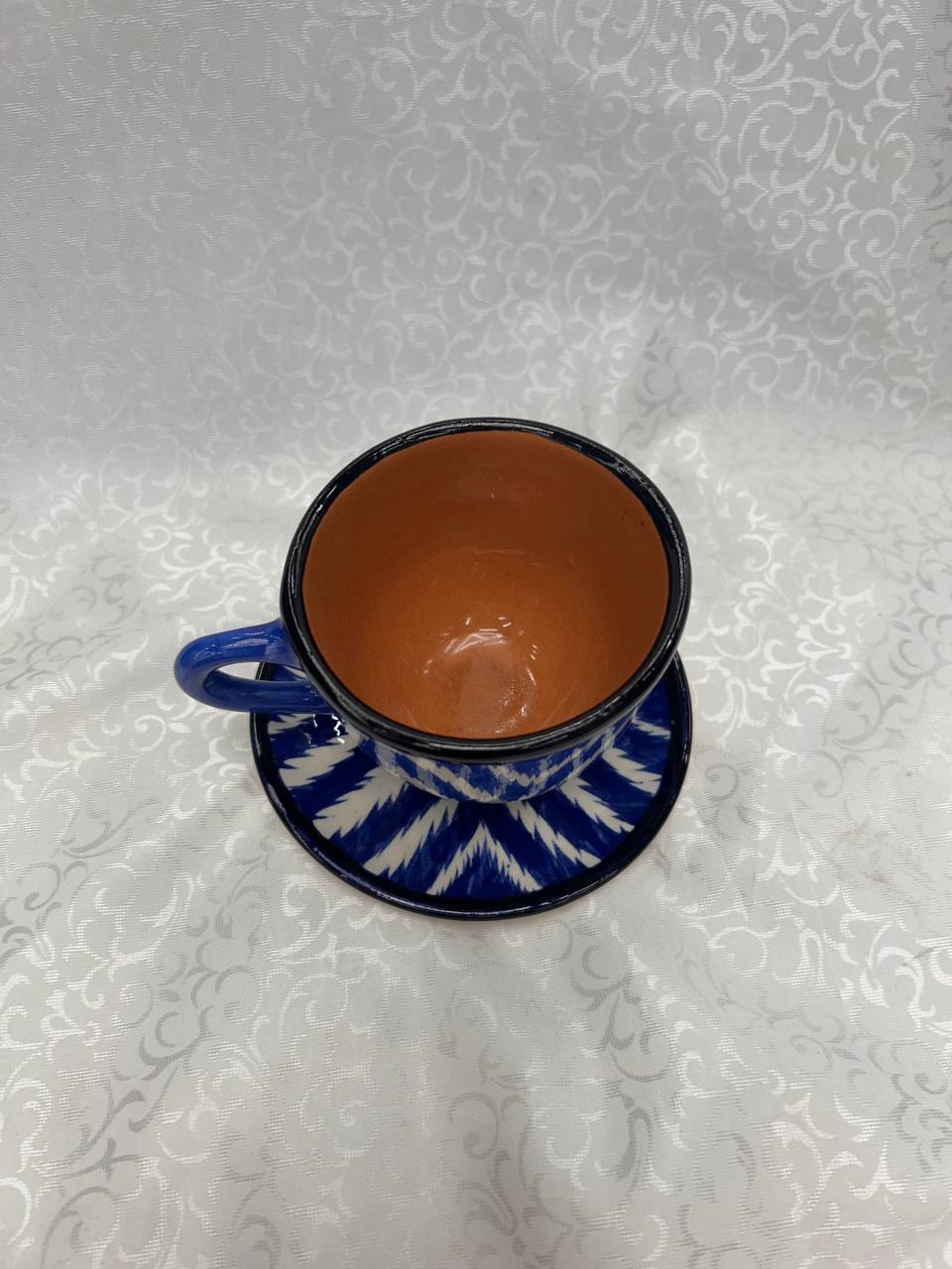 This beautiful handmade ceramic cup and saucer set features a traditional ikat pattern in deep blue and white tones. The warm terracotta-colored interior adds a unique contrast, creating a cozy and authentic feel for tea or coffee moments.