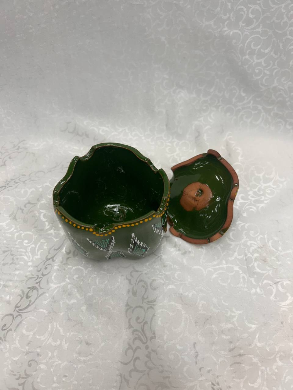 Introducing our beautiful handmade ceramic shakardon, designed in a rich green color with traditional ikat-style patterns. This elegant sugar bowl is perfect for adding a cultural and stylish touch to your table setting.
