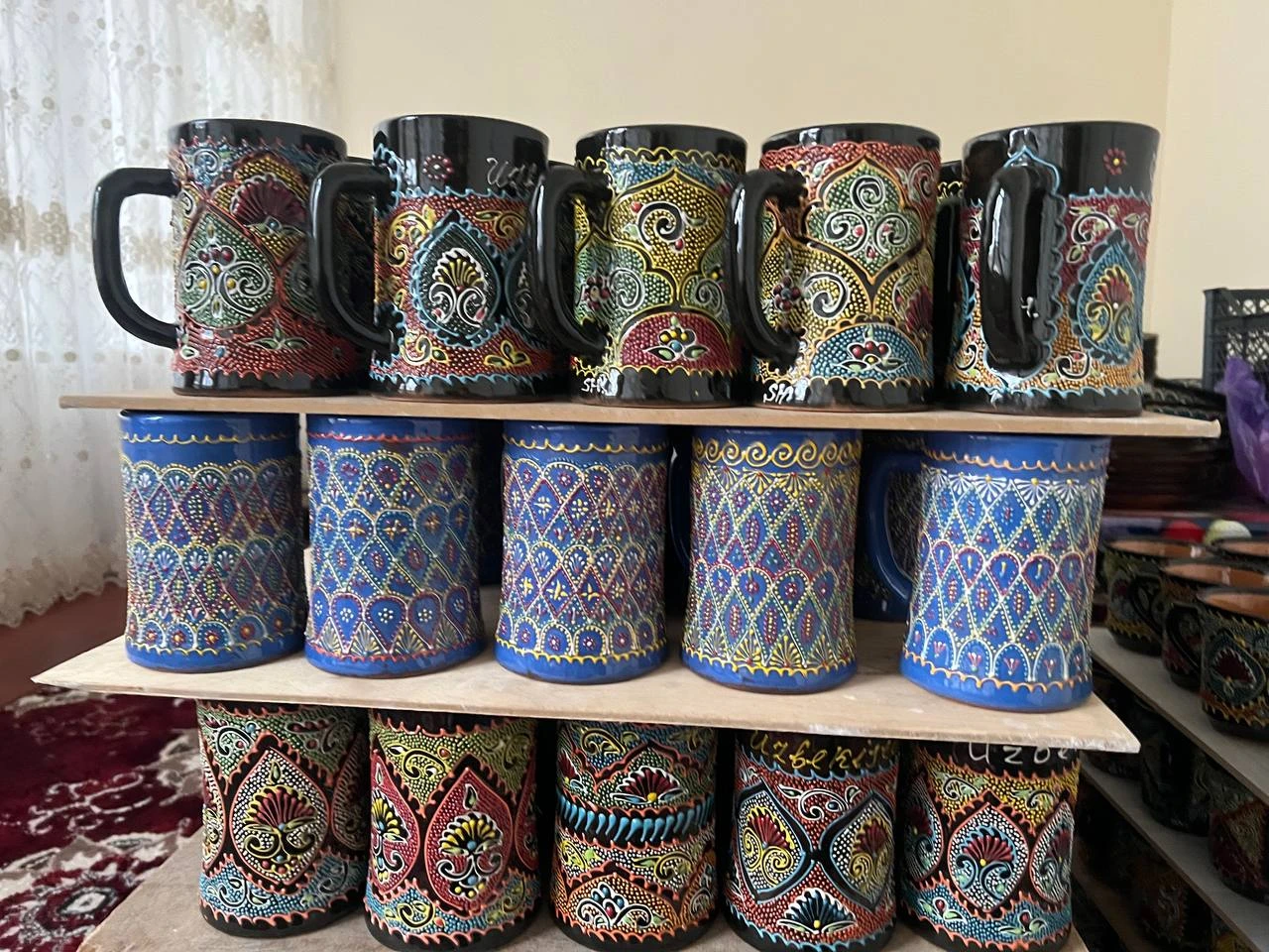 This is a handcrafted Uzbek ceramic dish with a matching lid, made from high-quality natural clay and finished with a glossy glaze. It is designed in a traditional round shape, featuring deep cultural ornamentation. Design & Ornamentation Pattern style: authentic Uzbek ethnic art Motifs include: paisley (buta), floral elements, and curved islimi vine ornaments Decoration technique: detailed hand-painted dotwork (nuqta naqsh) combined with fine contour lines Rim design: smooth black scalloped ceramic edges for an artistic handcrafted look Lid top: rounded ceramic knob for easy opening, coated in glossy black glaze Color Palette Main glaze base: deep black ceramic Ornament colors: gold, yellow, red, orange, turquoise, indigo, and green accents Composition: symmetrical layered center design with a decorated circular border Material & Quality Material: 100% ceramic natural clay Crafting: fully hand-molded and hand-painted Surface finish: glossy protective glaze for durability and premium appearance Heat-resistant: suitable for warm or hot food serving Not recommended for: long-term liquid storage unless inner-coated Uniqueness: each piece may have slight variations due to handmade craftsmanship Best Uses Serving dry foods, sweets, fruits, or snacks Home interior décor and table styling Cultural display for cafés, hotels, restaurants, and craft shops Premium handmade gift item with Uzbek heritage value Cultural & Market Value This dish reflects Uzbek ceramic artisan heritage, combining elegance, symmetry, and authentic hand-painted detail. A perfect choice for customers who value traditional ethnic décor, handmade artistry, and premium craftsmanship.