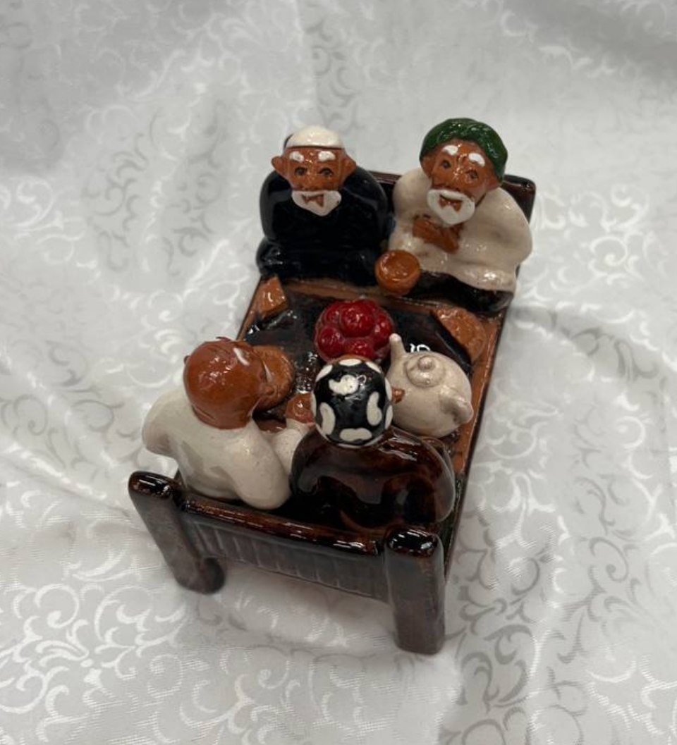 This charming handmade ceramic souvenir is inspired by the traditional Uzbek ayvon and tapchan setting. It beautifully depicts a cozy gathering scene around a low table, reflecting warmth, hospitality, and cultural heritage.