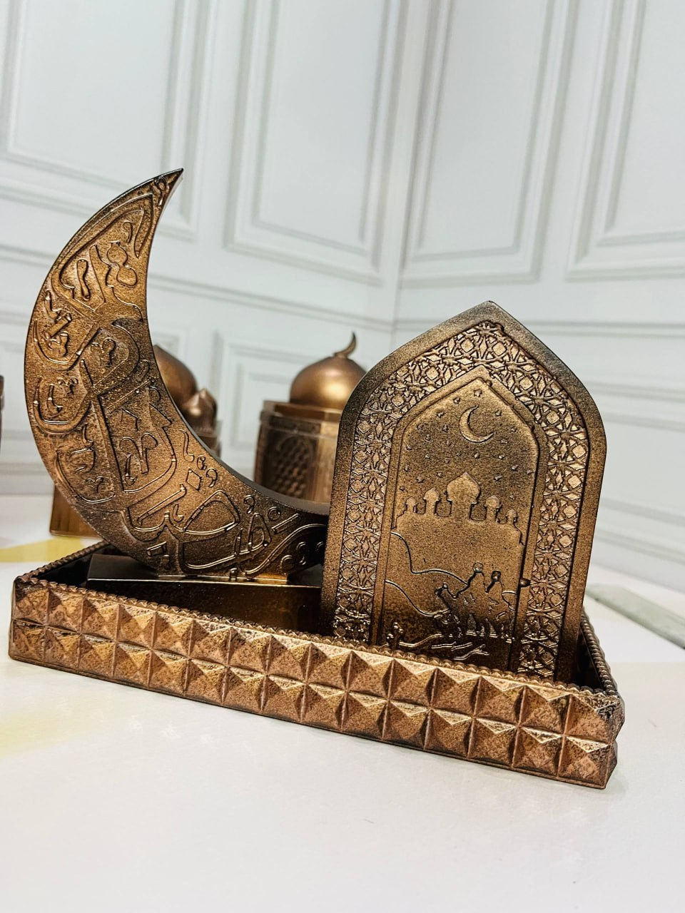 A beautiful handcrafted decorative set featuring a crescent moon with Arabic calligraphy and a mosque-shaped panel placed on a stylish base tray. The design reflects Islamic art and tradition, making it a meaningful decorative piece for homes, prayer corners, or special occasions such as Ramadan and Eid.