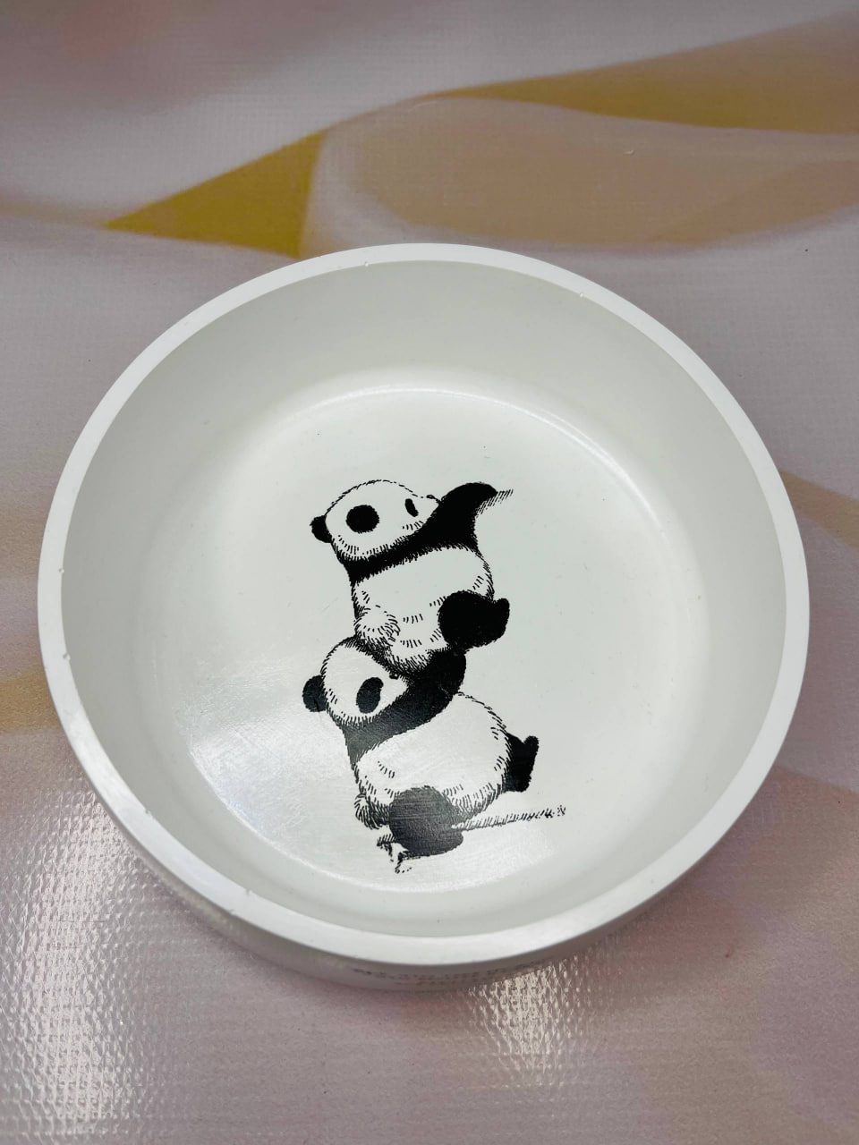 A handcrafted decorative bowl featuring charming panda illustrations. This unique piece combines playful design with artistic craftsmanship, making it a lovely decorative accent for any interior.