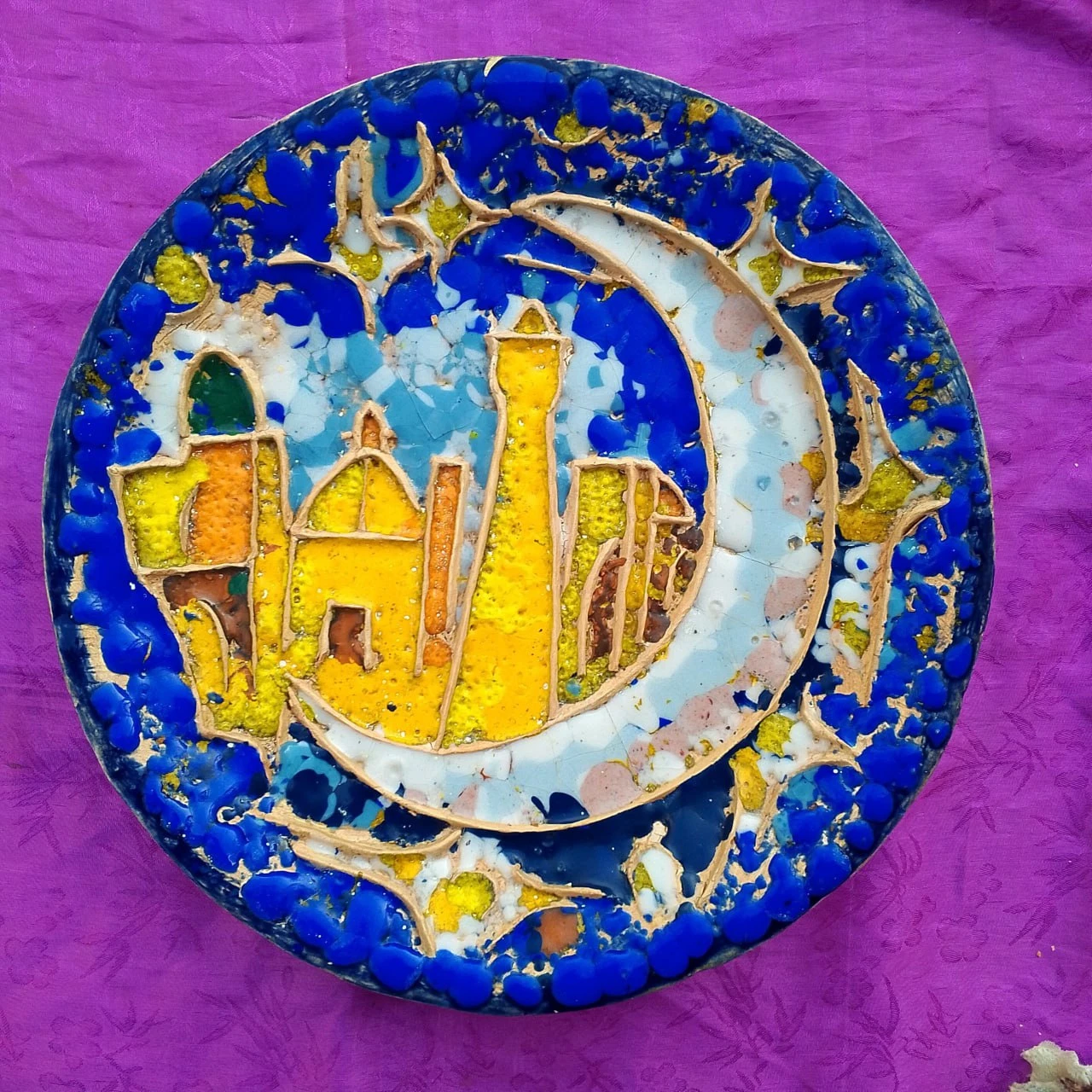 The Decorative Plate “Bukhara” is a vivid artistic representation of the historical and cultural spirit of the ancient city of Bukhara, crafted through traditional Uzbek ceramic techniques. The central design features a stylized cityscape with domes, minarets, and historic buildings, capturing Bukhara’s rich heritage and timeless beauty. Framed by crescent moon and star motifs, the plate establishes harmony between the city and the celestial world. The deep blue, turquoise, golden yellow, and white tones offer a luminous contrast, while the textured surface adds visual depth. Colored smalt creates a mosaic-like brilliance, providing a distinctive decorative character. The raised outlines and layered glazing highlight the artist’s mastery and attention to detail. Ideal as an interior statement piece, it is a meaningful cultural artwork that mirrors Uzbekistan’s artistic legacy.