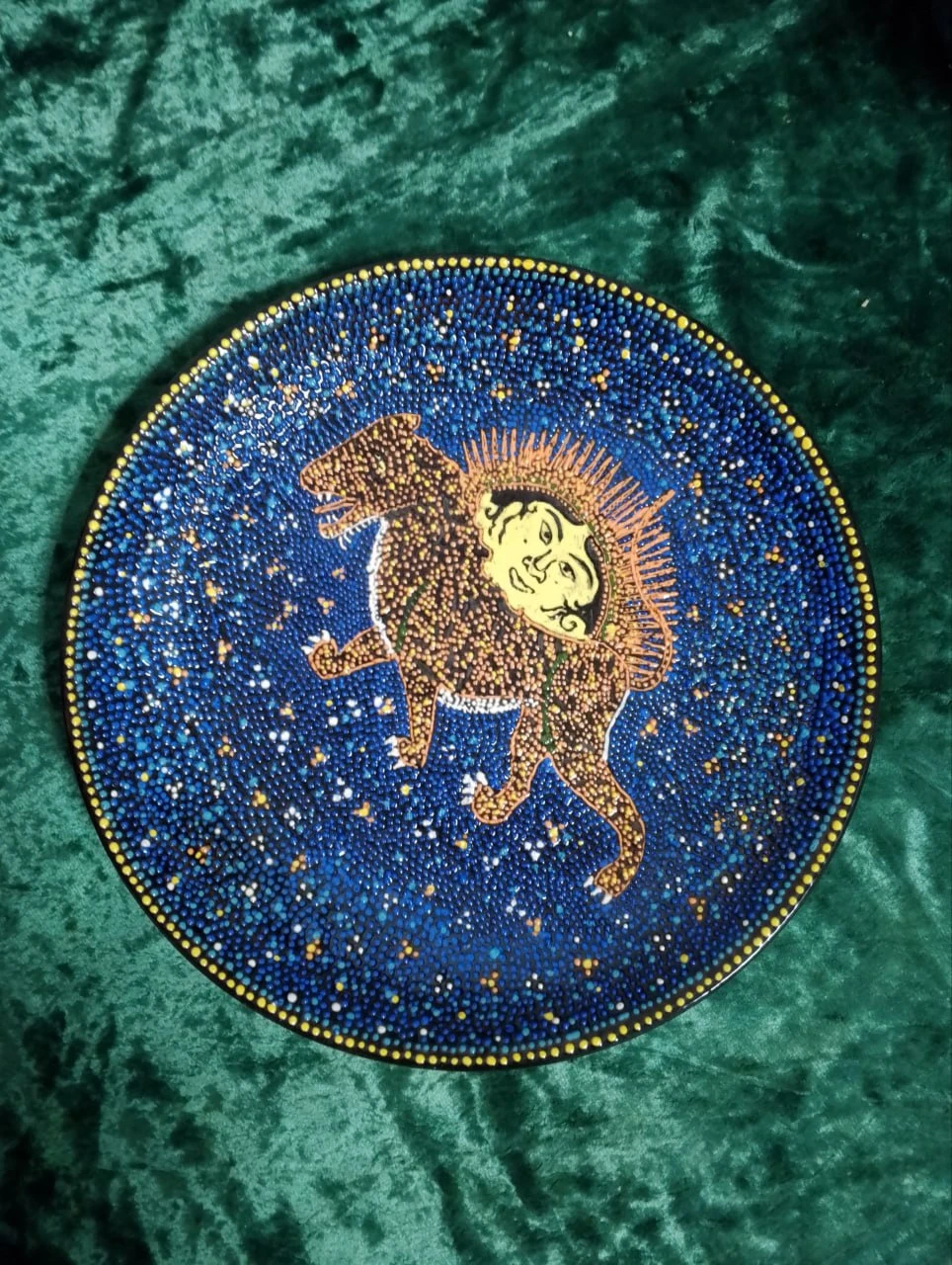 This decorative plate is a refined example of traditional Uzbek ceramic art from the Bukhara region, enriched with contemporary art interpretation. It features a central motif of a lion with a human face surrounded by sun rays, symbolizing strength, protection, vitality, and spiritual power. The deep blue background, crafted with a meticulous dotted technique, is accentuated with golden and white accents, giving a starry night sky effect, harmoniously framed by a dotted yellow border. The plate showcases the artist's patience, precision, and high craftsmanship, using traditional materials and glazing techniques. It serves as both an elegant interior decoration and a cultural piece representing Uzbekistan’s rich artistic heritage.