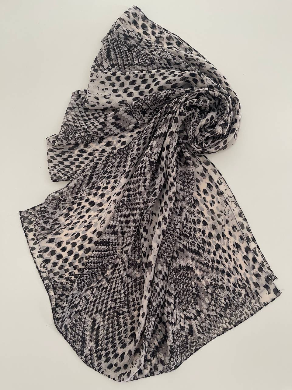 This stylish chiffon scarf features a beautiful animal-inspired pattern with a mix of leopard and snake print designs in neutral beige, black, and grey tones. Made from lightweight and breathable fabric, it feels soft on the skin and drapes gracefully.