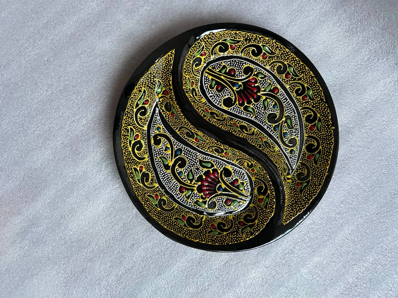 Design & Shape: Form: tall vases with a narrow neck and widened body, standing on a stable round base Style: inspired by Uzbek cultural heritage, featuring paisley (buta), floral, and geometric motifs Technique: detailed hand-painted dotwork combined with ornamental contour painting Rim finish: the top edges have a smooth, slightly raised ceramic border with a black glaze finish Color Palette: Main base: deep black glazed ceramic Ornament colors: gold, turquoise, yellow, red, orange, green, and indigo accents Inner surface (top opening): natural clay ceramic tone with a smooth, unpainted finish Material & Craftsmanship: Material: high-quality ceramic clay Production: 100% hand-molded and hand-painted Finish: glossy glaze coating for durability and elegant appearance Uniqueness: each vase is one-of-a-kind, with slight natural artistic variations Durability: suitable for long-term decorative use (not recommended for direct water storage unless a protective inner coating is added) Best For: Home interior décor (traditional and modern spaces) Cultural display in hotels, offices, galleries, and craft stores Premium heritage gifting Ornament-focused styling pieces for shelves, tables, or entrance areas Cultural Value: These vases represent authentic Uzbek ceramic artistry, blending symmetry, heritage patterns, and premium craftsmanship, making them ideal for customers who appreciate ethnic elegance and handmade décor.