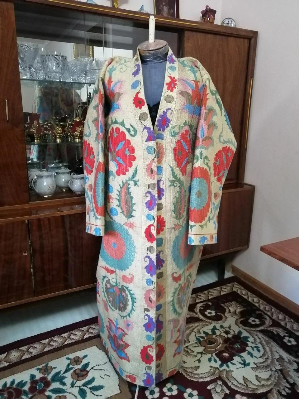 Lightweight, smooth, and naturally glossy, the silk fabric flows beautifully over the body, while the dense Iroqi stitching highlights the structure of the chapan. This rare combination of precious material and historic technique makes the garment a true collectible piece.