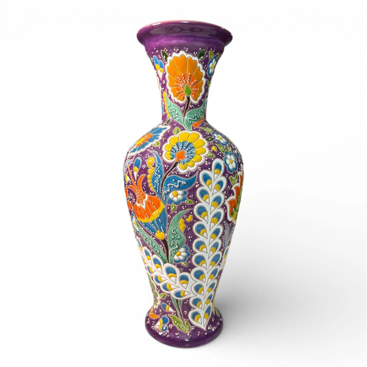 This handcrafted enamel ceramic vase showcases vibrant, hand-painted floral ornaments inspired by traditional Uzbek art. The surface is coated with high-quality enamel glaze, giving it a smooth, glossy, and long-lasting finish. Each pattern is carefully painted by skilled local artisans, making every piece unique. The vase stands 40 cm tall, featuring an elegant narrow neck and a balanced round body design that adds sophistication to any interior space. Its rich color palette blends shades of blue, purple, orange, green, and gold-accented floral details, creating a bold yet artistic decorative statement. Perfect for home décor, hotel lobbies, office spaces, and gift collections, this vase works beautifully with modern, classic, and ethnic interior themes. It can be used with or without flowers as a standalone decorative piece. Key Features: 100% handmade by Uzbek craftsmen, Premium enamel glazed coating, Traditional floral ornament design, Height: 40 cm, Durable, glossy, and fade-resistant surface, Ideal for décor, gifting, and display.
