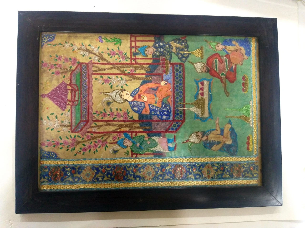 This is a 100% handmade and hand-painted artwork created in the traditional Uzbek miniature art style, a classic form of cultural visual storytelling. The painting portrays a lively traditional gathering scene featuring multiple figures in national attire, seated and standing in a natural landscape. At the center of the composition, a decorated traditional Uzbek tent (yurt-inspired structure) is illustrated, surrounded by blossom trees and ornamental patterns. The people are painted wearing layered cultural garments in shades of blue, green, red, orange, and purple, enriched with gold-accented hand-brush details, reflecting motifs similar to Uzbek atlas, adras, and ikat fabrics. The lower section of the artwork includes a wide decorative ornamental border featuring geometric and floral-inspired patterns, giving the piece a balanced, antique, and heritage-rich aesthetic. The artwork is enclosed in a rectangular dark wooden frame and protected behind glass for durability and long-term preservation. Artistic and Decorative Highlights: 100% handmade and hand-painted, Uzbek cultural gathering and tent illustration, intricate patterns inspired by traditional Uzbek textiles, gold-accented brush detailing. Protected behind glass, dark wooden rectangular frame. Suitable for wall display, cultural decor, art collections, and gifting. This artwork is ideal for both youth and adult audiences who appreciate handmade cultural art, heritage design, and premium craftsmanship.