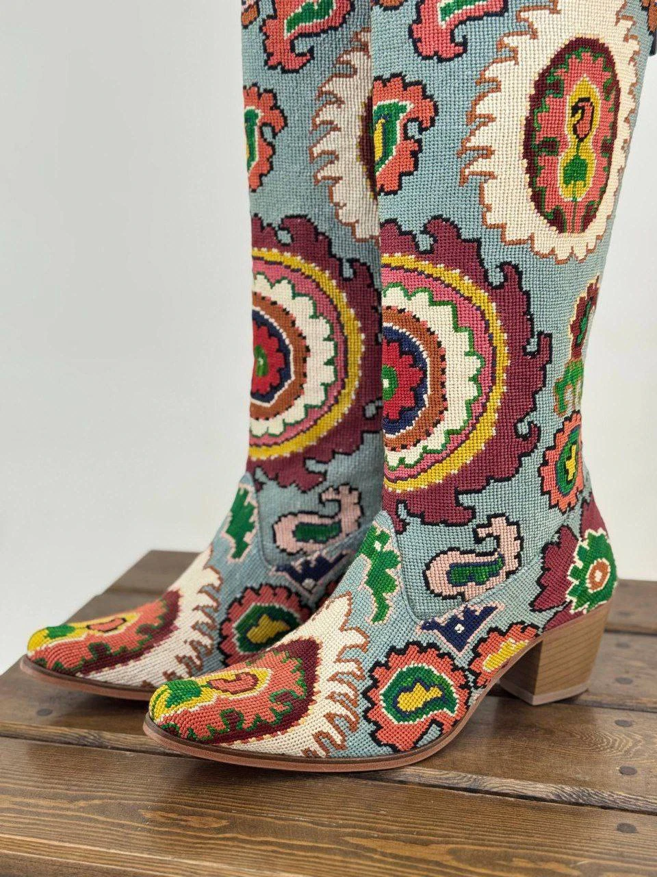 These handcrafted embroidered ethnic pattern boots are a perfect blend of traditional artistry and modern elegance. Made with exceptional attention to detail, each pair features intricate needlework inspired by cultural and vintage motifs. The colorful geometric and floral patterns create a unique and eye-catching design that stands out in any outfit.