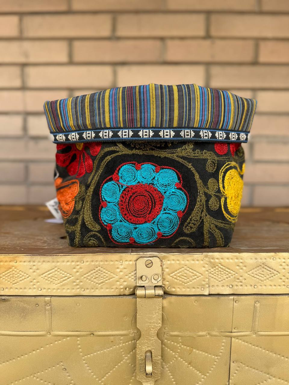 This handmade Uzbek embroidered textile organizer basket is a beautiful combination of traditional craftsmanship and practical design. Featuring intricate floral embroidery on high-quality fabric with a colorful ikat-style trim, it brings an authentic ethnic touch to any interior.