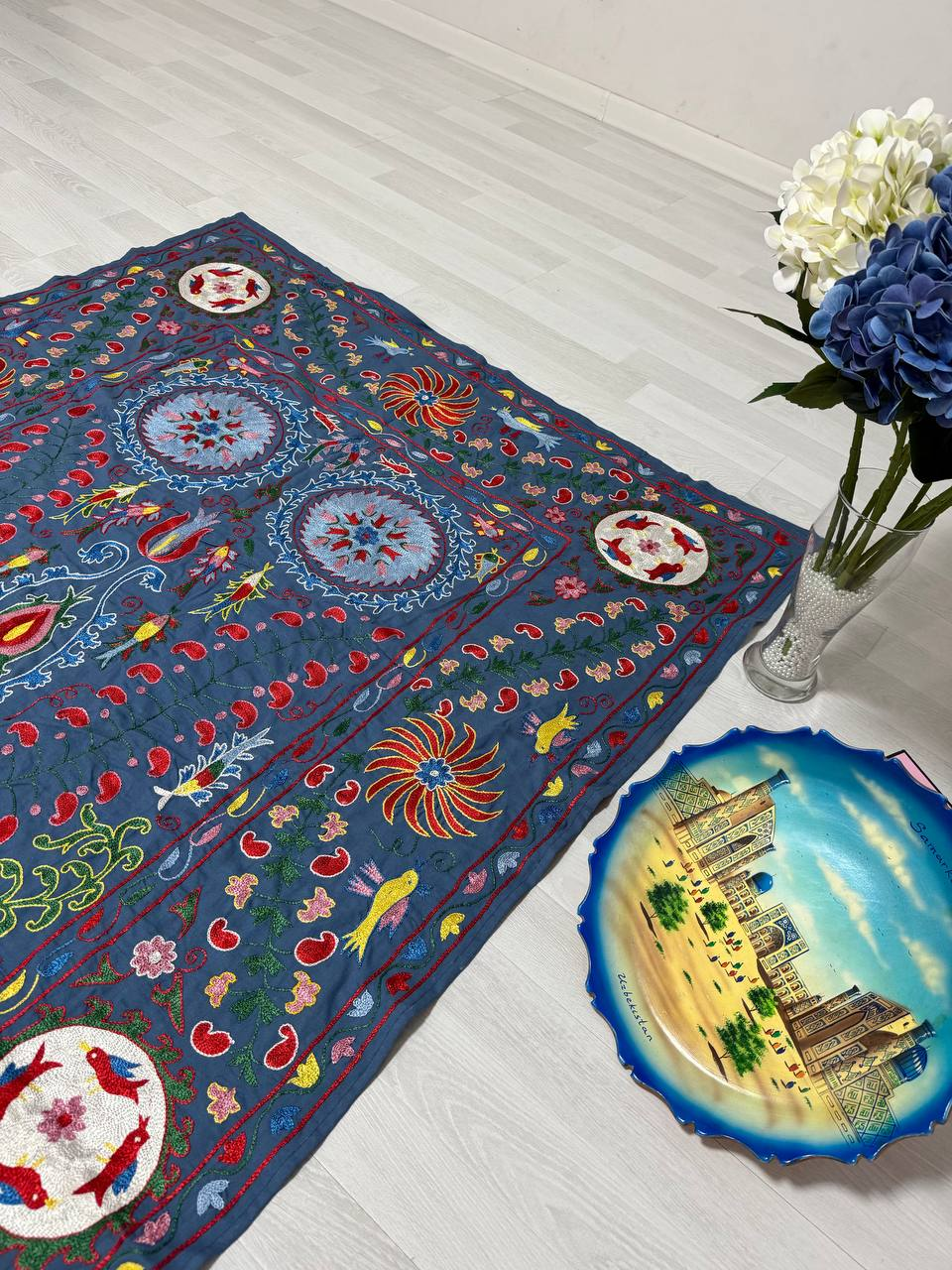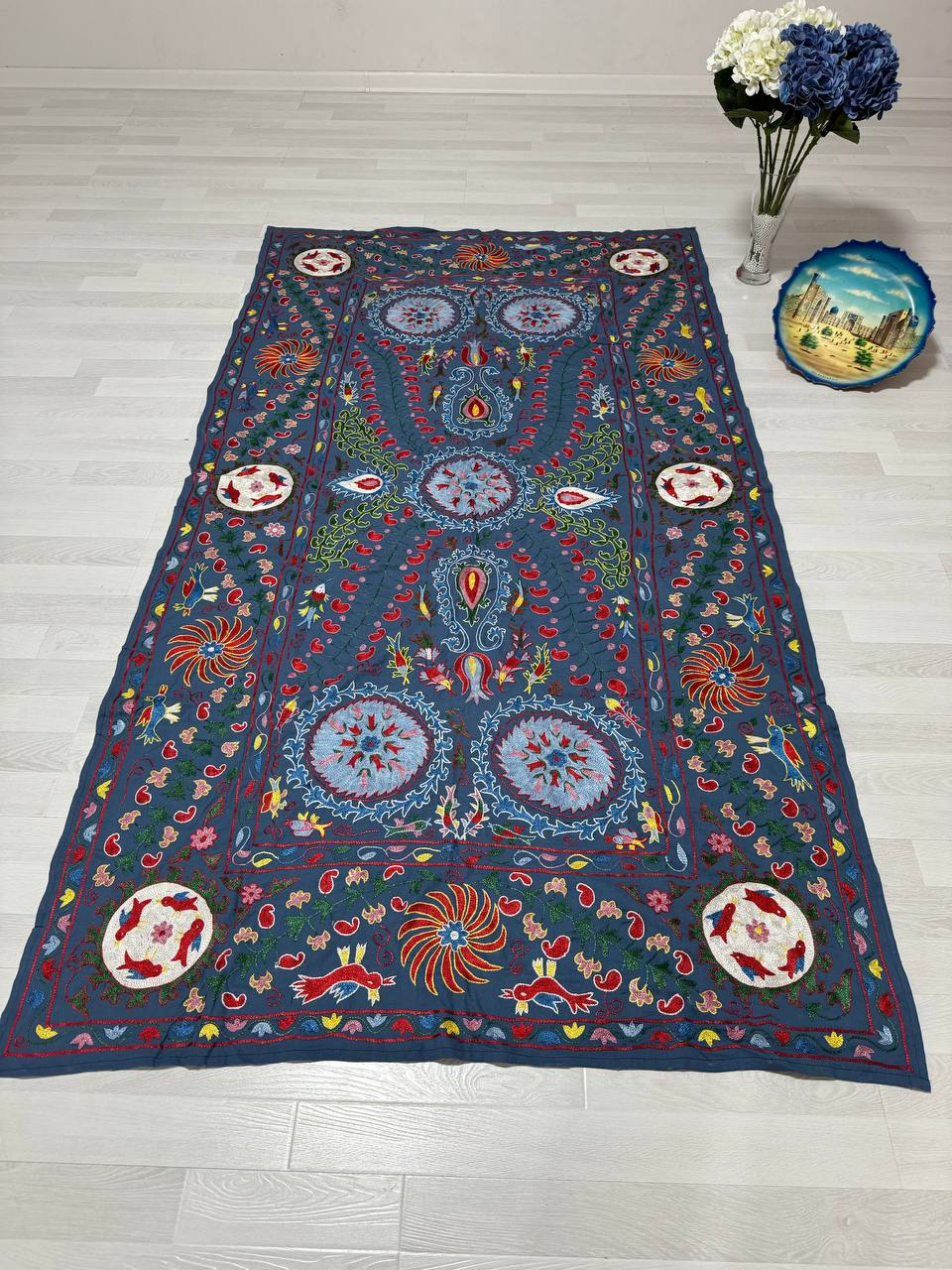 The embroidery is fully hand-stitched using a traditional hook technique, showcasing skilled craftsmanship and careful attention to detail.